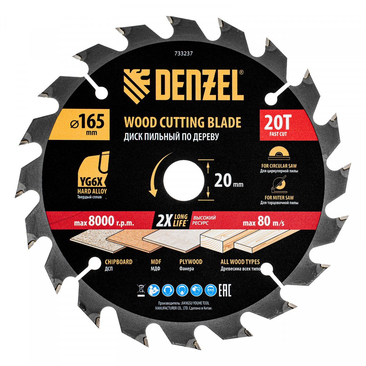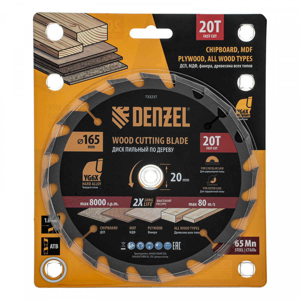 Пильный диск Denzel 733237 диаметром 165 x 20 мм, с 20 зубьями, предназначен для продольного и поперечного распила твердой и мягкой древесины, фанеры, МДФ, ДСП. 20 зубьев типа ATB с режущими пластинами оптимальной геометрии обеспечивают быстрый рез. Режущие пластины из твердого сплава YG6X сохраняют рабочие свойства при интенсивном использовании. Диск устанавливается на циркулярную, торцовочную пилу или на распиловочный станок. В комплект поставки входит переходное кольцо с 20 на 16 мм, что позволяет изменить посадочный размер и расширяет возможности использования диска.