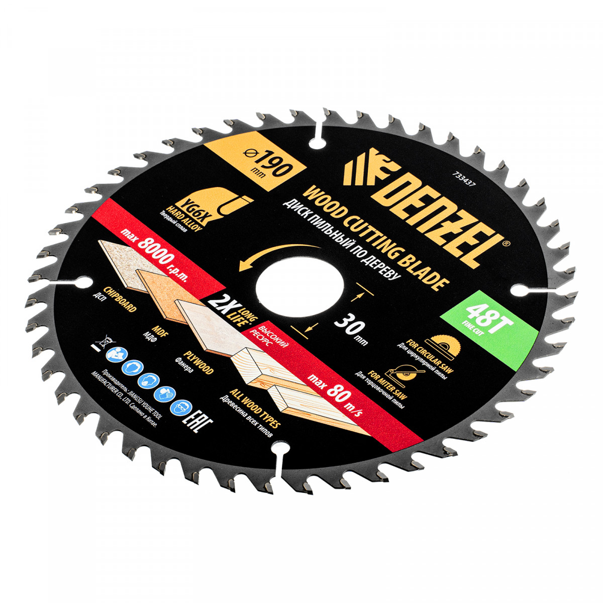 Тонкий пильный диск Denzel 733437 диаметром 190 x 30 мм, с 48 зубьями, устанавливается на циркулярную, торцовочную пилу или распиловочный станок и предназначен для выполнения работ по дереву. Подходит для распиливания древесины любого типа, а также фанеры, ДСП, МДФ. Зубья типа ATB обеспечивают высокое качество и скорость как продольного, так и поперечного распила. Тип реза — стандартный. Толщина диска уменьшена, что повышает производительность и снижает нагрузку на инструмент. На зубья напаяны твердосплавные пластины, длительное время сохраняющие режущую способность. Пластины из твердого сплава YG6X прошли многоступенчатую заточку, что позволило достичь оптимальной геометрии и максимальной эффективности распиловки.