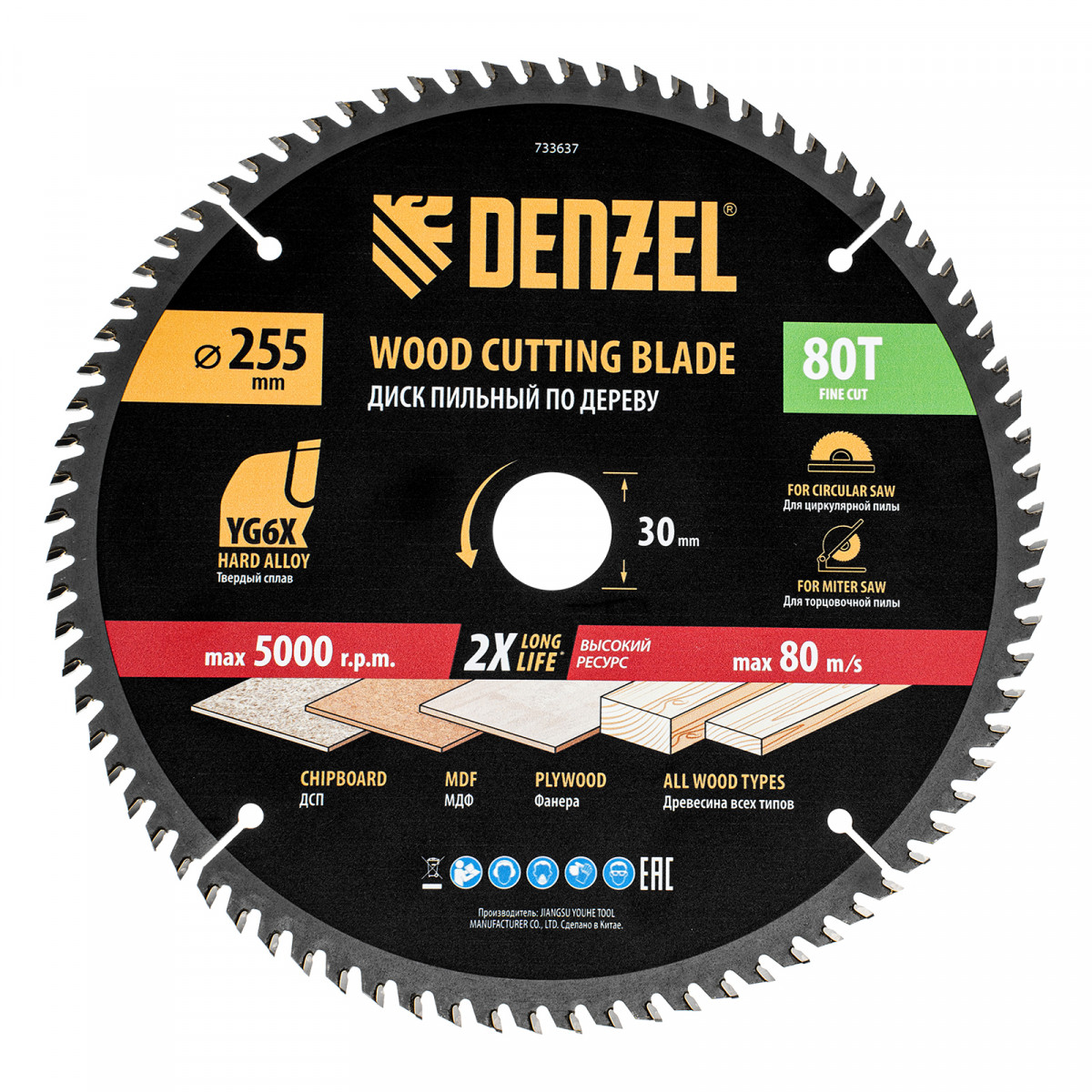 Пильный диск Denzel 733637 диаметром 255 x 30 мм, с 80 зубьями, предназначен для точного продольного и поперечного распила твердой и мягкой древесины, фанеры, МДФ, ДСП. 80 зубьев типа ATB с режущими пластинами оптимальной геометрии обеспечивают максимально чистый рез. Режущие пластины из твердого сплава YG6X сохраняют рабочие свойства при интенсивном использовании. Диск устанавливается на циркулярную, торцовочную пилу или на распиловочный станок. В комплект поставки входит переходное кольцо с 30 на 20 мм, что позволяет изменить посадочный размер и расширяет возможности использования диска.