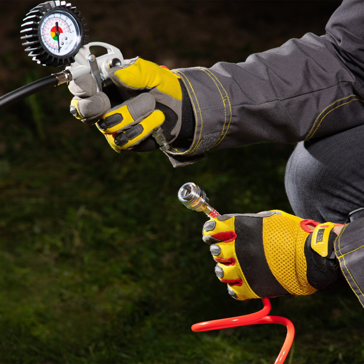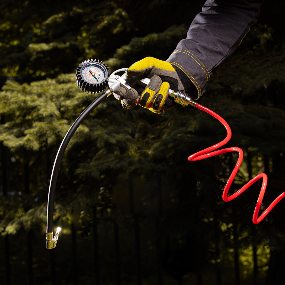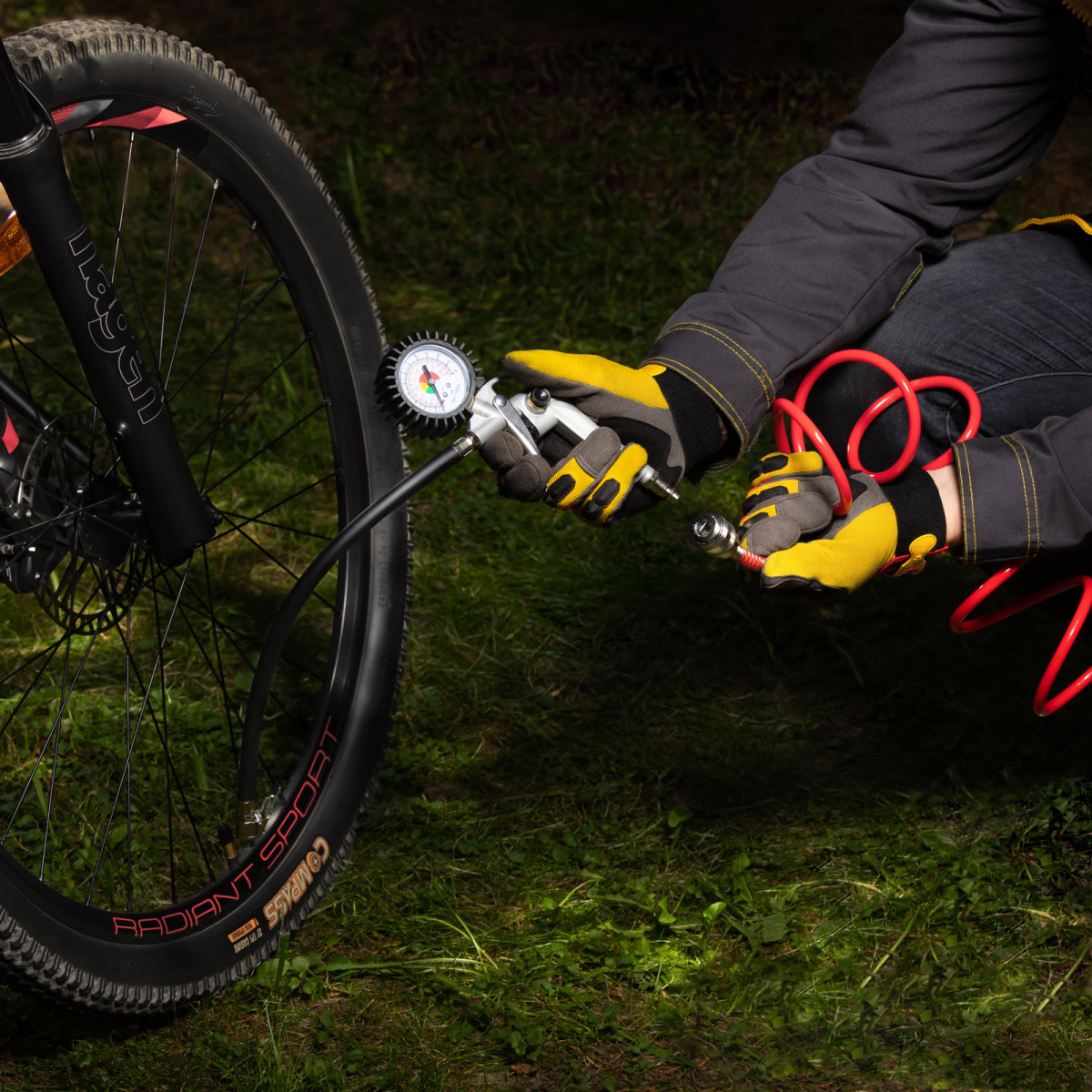 - Контроль параметров работы — 2 шкалы на манометре (Пси и Бар) позволяют отслеживать и регулировать давление в шинах.