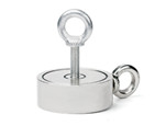 Поисковый - это неодимовый магнит, помещенный в стальной корпус. В комплект входит рым-болт (один или два, в зависимости от вида магнита). Он предназначен для крепления веревки или троса, а также служит для отсоединения примагниченных предметов от поверхности магнита. В основном поисковые магниты применяются для работ в водоемах, если нужно поднять со дна металлические предметы