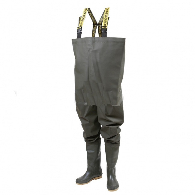 Полукомбинезон с регулируемыми по высоте лямками и пластиковым разделителем на спине, удобным внутренним карманом. Полукомбинезон изготовлен из водонепроницаемого материала (трикотажного полотна пропитанного ПВХ) и приварен к сапогам.