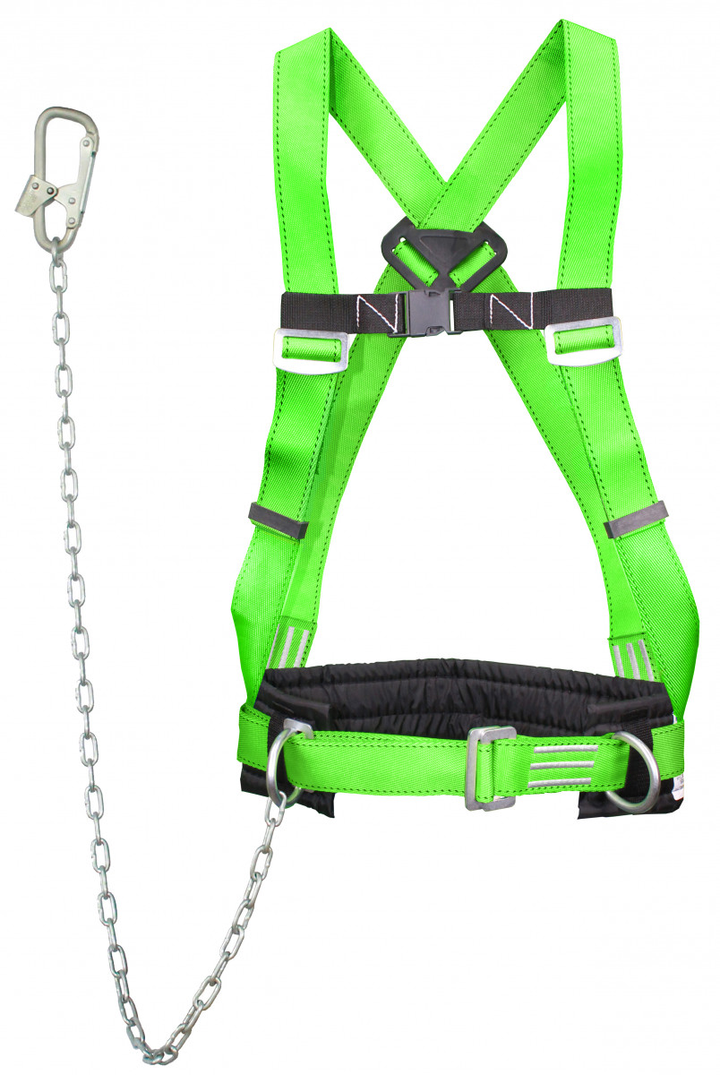 Включает в себя ремень с пряжкой (позволяет подгонять пояс по фигуре человека), подкладку под ремень (кушак), наплечные лямки, элементы крепления – два металлические D-кольца на ремне привязи и одно на спине, строп из металлической цепи с монтажным карабином (4 типа карабинов), бирку, выполненную в соответствии с ГОСТ Р ЕН 365, паспорт-инструкцию с отметкой ОТК и гарантией производителя (закреплен под биркой на кушаке).
