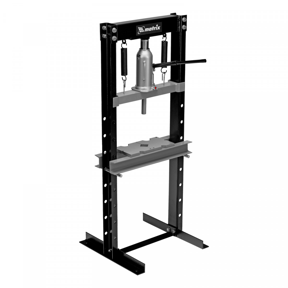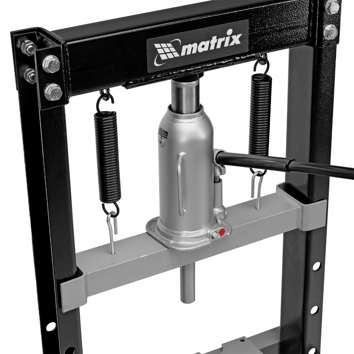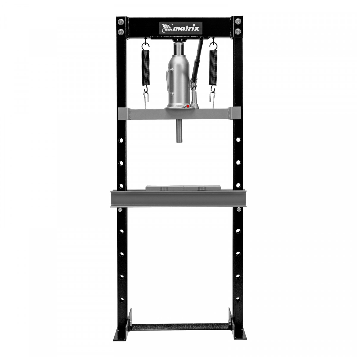 Гидравлический пресс Matrix 523105 размером 1360 х 500 х 510 мм, воздействующий на детали с усилием 12 т, поставляется комплектом из 2 частей. Используется для запрессовки и выпрессовки различных деталей, необходимых для ремонта автомобилей. Изготовлен из толстого прочного металла и имеет простую разборную конструкцию из верхней и нижней балок, стоек, станин и гидравлического бутылочного домкрата. Пресс подойдет для самостоятельного использования в гараже.