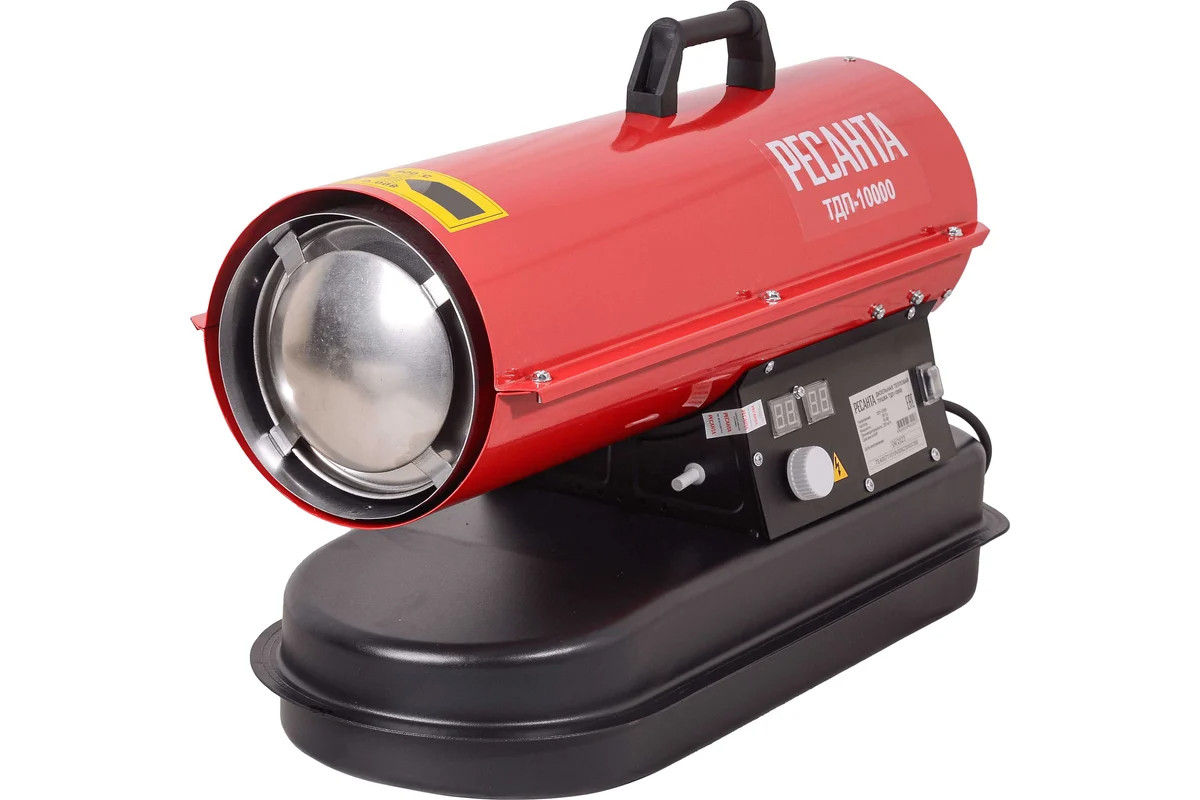 Ресанта ТДП-10000 относится к приборам с прямым типом нагрева. Промышленный вентилятор с производительностью 320 м³/час прогоняет воздух сквозь пламя горелки. Температура выходящего воздуха достигает 800 градусов. Продукты горения отводятся вместе с воздухом. Поэтому дизельные тепловые пушки рекомендовано использовать в нежилых помещениях с качественной вентиляцией.
