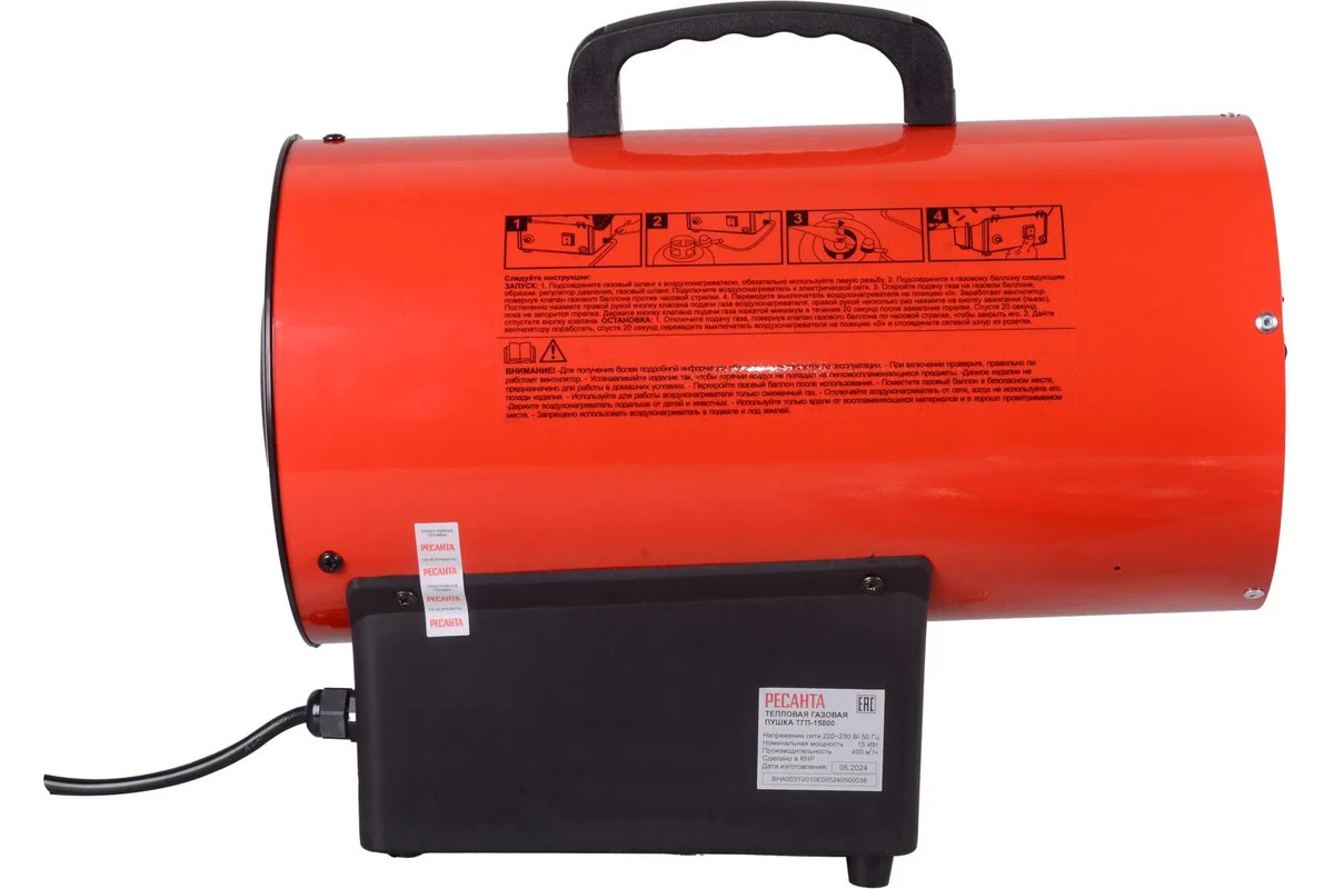 Теплопушка Ресанта ТГП-15000 - это высокопроизводительный воздухонагреватель, который работает на сжиженном газе. Благодаря высокой мощности, хорошо подходит для обогрева помещений большой площади.