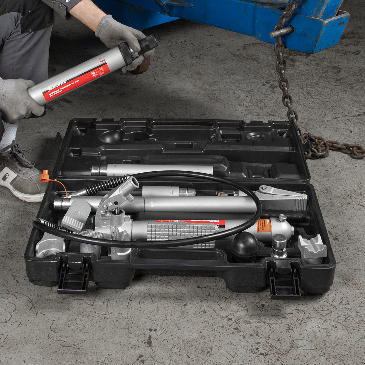 Гидравлическая растяжка Matrix 513405, рассчитанная на усилие до 10 т, входит в набор из 17 предметов — гидронасоса, цилиндра, удлинителя, опорной площадки, адаптера и 7 сменных насадок в пластиковом кейсе. Используется для восстановления геометрии металлических изделий. Можно выбрать оптимальную насадку в зависимости от марки автомобиля, а также области и степени повреждения. Растяжка будет полезна для выполнения кузовных работ и рихтовки металлоконструкций.