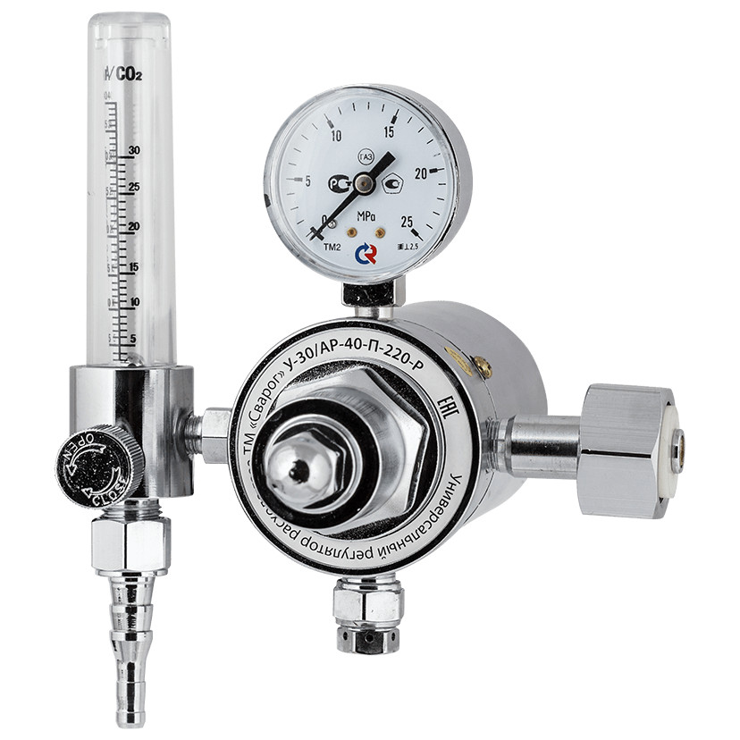 Регулятор расхода газа универсальный У-30/АР-40-П-220-Р Сварог 1C008-0120 AR/CO2 220V95645 предназначен для понижения и регулирования давления газа, поступающего в регулятор из баллона, и автоматического поддержания расхода газа на постоянном уровне. Оснащен ротаметром для определения объёмного расхода газа.