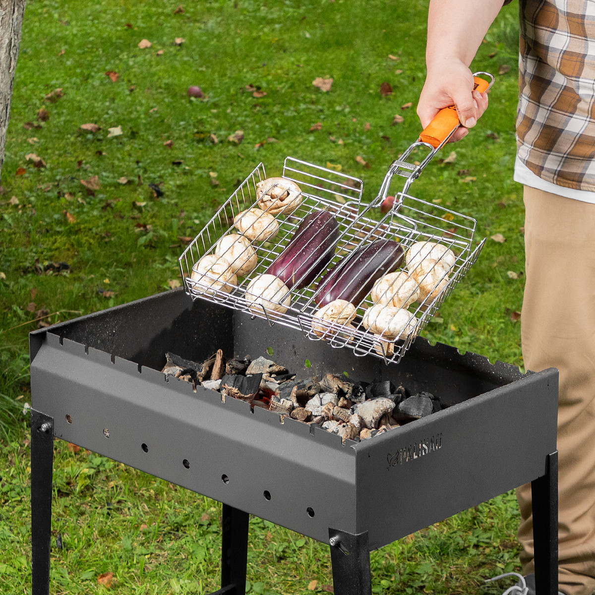 - За счет увеличенных опорных стержней решетка надежно фиксируется на мангале, а для жарки используется вся рабочая площадь.