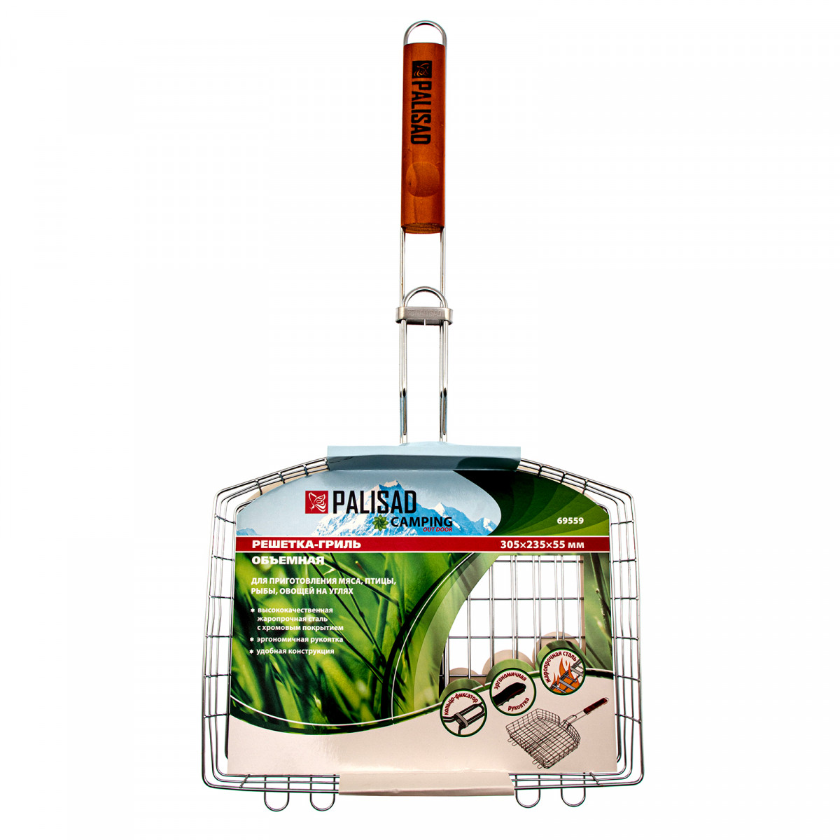 Объемная хромированная решетка гриль Palisad Camping 69559 размером 305 х 235 х 55 мм позволяет легко жарить пищу с двух сторон в мангале. Объемная конструкция решетки с возможностью регулировки высоты позволяет приготовить крупные куски мяса и куриную тушку без потери сочности.