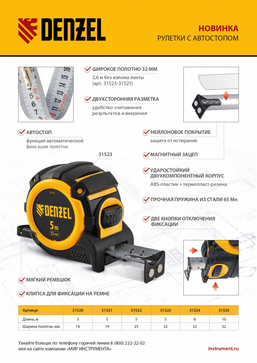 Рулетка 5м х 25мм, автоматич. фиксац., нейлон. покрытие, магнит. зацеп, двухстор. разметка Denzel
