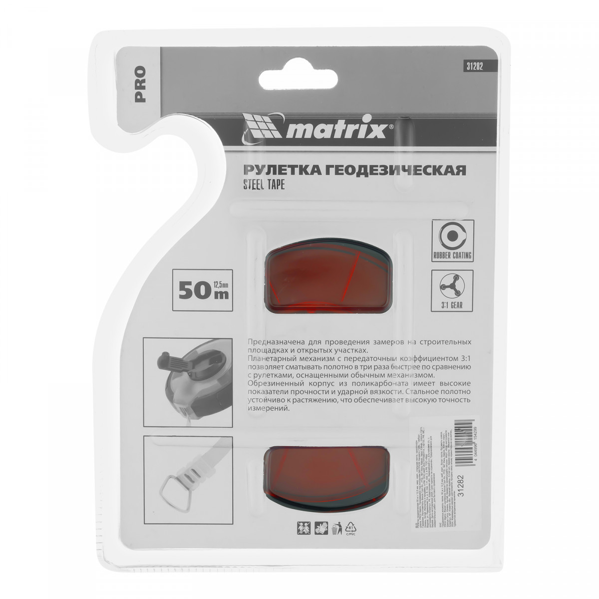 Рулетка геодезическая 50 м х 12,5 мм, закрытый корпус, стальная лента, односторонняя шкала, Pro Matrix