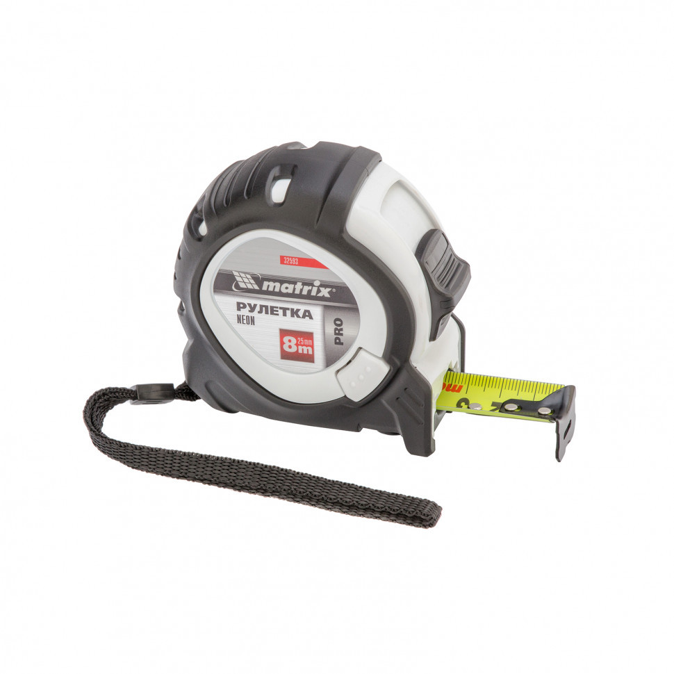 Рулетка Matrix PRO Neon 32593 в обрезиненном корпусе, с 3 механизмами фиксации ленты длиной 8 м и шириной 25 мм, служит для определения расстояний и размеров различных предметов. Крупные цифры на матовом желто-зеленом полотне хорошо видны, что облегчает считывание результатов. Измерительное полотно можно зафиксировать на нужной отметке при помощи стопора или одной из двух кнопок-пауз — это удобно при проведении большого количества замеров. Рулетка предназначена для выполнения профессиональных и бытовых измерительных работ.