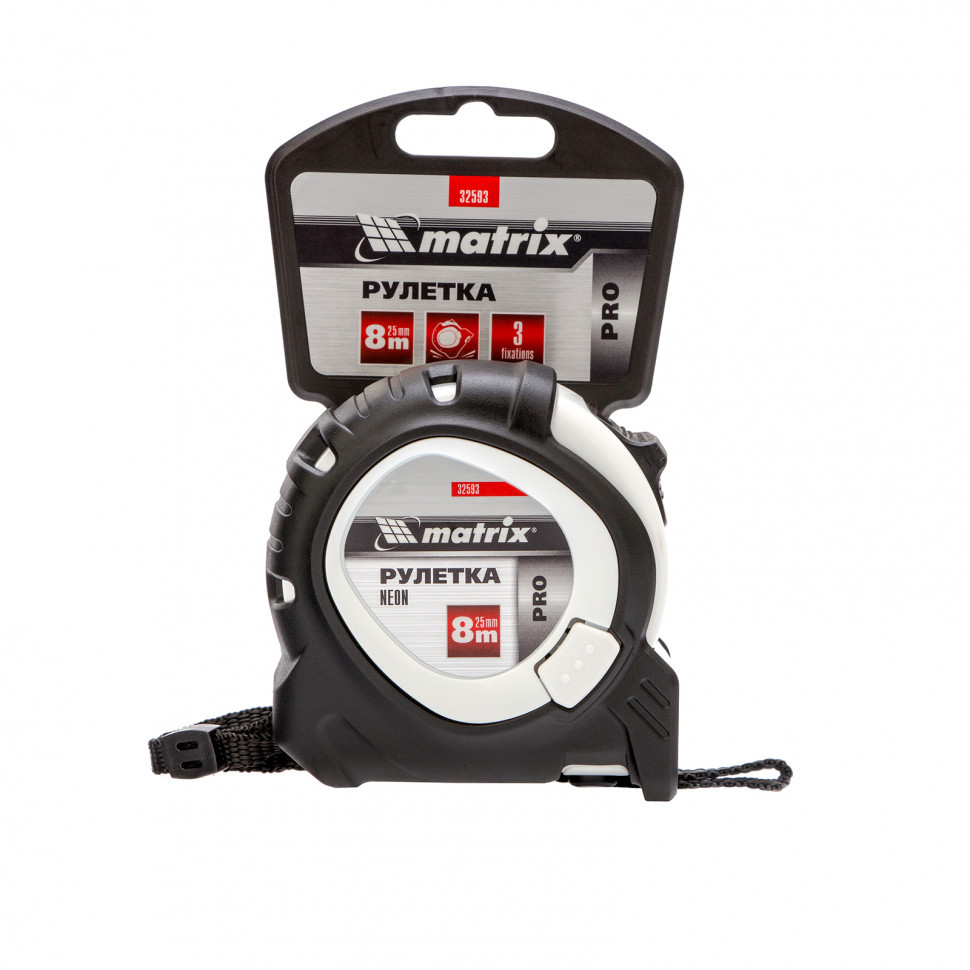 Рулетка Neon,8 м x 25 мм,обрезиненный корпус,3 фиксации,Pro Matrix
