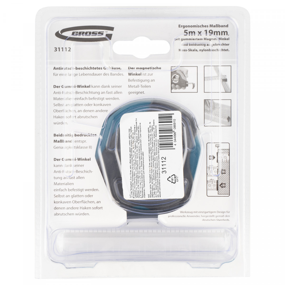 Рулетка Gross «Schlagfest» 31112 с магнитным обрезиненным зацепом, двухсторонней шкалой и функцией автоматической фиксации полотна длиной 5 м и шириной 19 мм, с нейлоновым покрытием, позволяет определять размеры предметов, вычислять площадь помещения и проводить другие измерительные работы. Магнитный обрезиненный зацеп надежно фиксируется на скользких и металлических поверхностях со сложной формой. Карманная рулетка пригодится на строительной площадке и в быту.