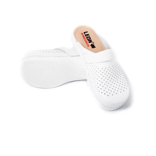 Сабо ЛЕОН - медицинские кожаные сабо женские MED102 разработаны при участии врачей ортопедов. Натуральная 100% кожа использована для верха, подкладки и стельки обуви. Тапочки имеют слой массажной пены с памятью под кожаной стелькой, который принимает форму вашей ступни. Такая стелька дает опору, подходящую именно вам. При ходьбе осуществляется массажное воздействие на ступню, что улучшает кровообращение и снижается отечность ног. Ортопедические сабо для профессионального использования. Могут использоваться как сабо поварские, обувь для медиков и всех, кому приходиться много времени проводить на ногах. Легкая полиуретановая подошва, оснащена амортизационной вставкой, что уменьшает усталость ног. Антискользящая основа позволит чувствовать себя уверенно на кафеле и паркете. Верх обуви изготовлен из мягкой натуральной кожи, устойчивой к износу. Она не впитывает влагу и запахи, ее легко мыть. Перфорация обеспечивает хорошую вентиляцию и ноги остаются сухими.