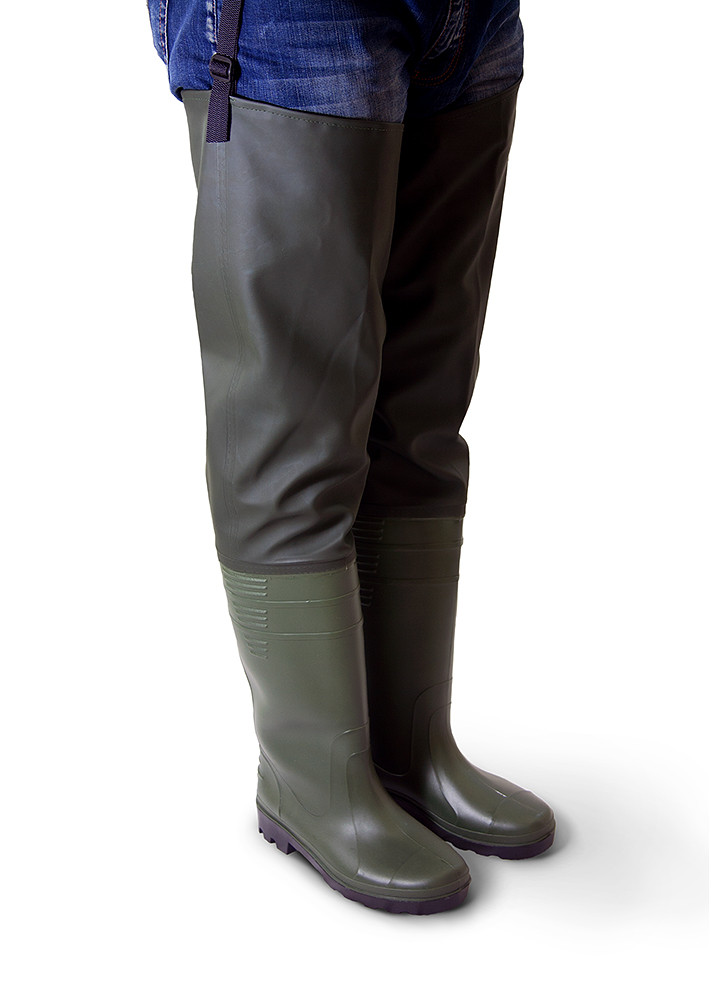 Рыбацкие сапоги изготавливаются на основе высокой модели мужских сапог из ПВХ и надставки из винитола (прочная водонепроницаемая ткань с ПВХ пропиткой). Сапоги ПВХ и надставка крепятся друг к другу путем приварки высокочастотными токами, что делает модель герметичной. В рыбацких сапогах, изготовленных по этому методу, возможно заходить в воду на глубину до 80 см., не опасаясь промочить ноги. На рыбацких сапогах области колен усилены дополнительным слоем ПВХ ткани, что придает рыбацким сапогам дополнительную прочность и смягчение при опоре на колено. Эта модель рыбацких сапог универсальна: возможно использование как в качестве, непосредственно рыбацких сапог, так и в качестве обычных сапог ПВХ (надставка рыбацких сапог прекрасно скатывается не образуя изломов). В верхней части надставки рыбацких сапог предусмотрены специальные крепления к поясному ремню. Данное крепление позволяет рыбацким сапогам правильно сидеть на ноге и, благодаря этому, максимально защищать ноги от влаги.