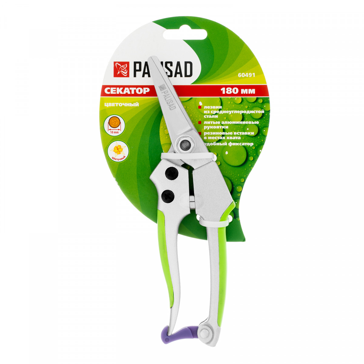Цветочный секатор Palisad 60491 длиной 180 мм, с металлическими обрезиненными рукоятками, будет полезен дома, на даче, в саду и огороде. При помощи расположенных в параллельных плоскостях лезвий быстро и аккуратно срезает молодые побеги и стебли толщиной до 10 мм. Подходит для оформления крон бонсай и создания топиариев. Пригодится также в домашнем хозяйстве — им удобно резать картон, бумагу, ткань, подвязочный материал. Режущие кромки с прецизионной заточкой обеспечивают легкость реза, плотность смыкания лезвий регулируется при помощи крепежного винта.