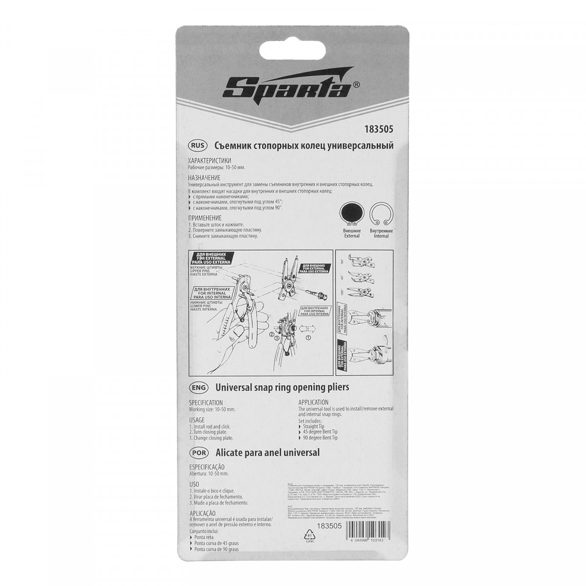 Универсальный съемник Sparta 183505 длиной 150 мм, с насадками, избавляет от необходимости приобретать отдельные инструменты для внешних и внутренних стопорных колец. В зависимости от способа установки насадки съемник способен работать как на сжим, так и на разжим. Используется для колец с отверстиями. Будет полезен в ремонтной мастерской, дома или в гараже.