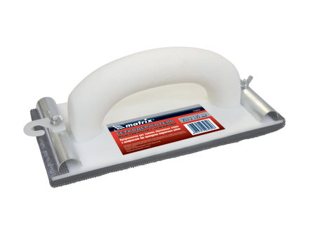 Сеткодержатель для шлифования пластиковый имеет специальные металлические фиксаторы для надёжного зажима шлифовальной бумаги и абразивных сеток. Отличительными особенностями данной конструкции являются: 1. Утолщенная ручка, обеспечивающая удобный и надежный хват. 2. Мелкопористая прокладка повышенной износостойкости. Материал, из которого она изготовлена, имеет хорошие упругие характеристики, позволяющие выдерживать большее прилагаемое усилие, а увеличенная толщина позволяет обеспечить равномерное прилегание даже на очень неровных поверхностях. 3. На элементы крепежа нанесено антикоррозионное покрытие, защищающее от ржавчины и позволяющее мыть сеткодержатель после работы. Современные материалы и технологии позволили сделать этот инструмент максимально прочным, легким, дешевым и удобным в работе. Данная конструкция представлена двумя типоразмерами, соответствующими наиболее популярным размерам применяемых абразивных материалов.