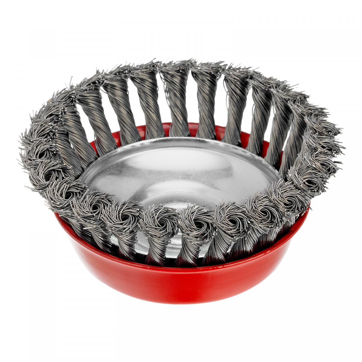 Щетка Matrix «Чашка» 74627 диаметром 125 мм, с присоединительной резьбой М14, с щетиной из крученой проволоки диаметром 0,5 мм, устанавливается на УШМ, поддерживающую работу со скоростью 6500 об/мин. Изделие предназначено для грубой (черновой) обработки поверхностей и подходит для удаления загрязнений, снятия толстого слоя ржавчины, ЛКМ, зачистки сварных швов.