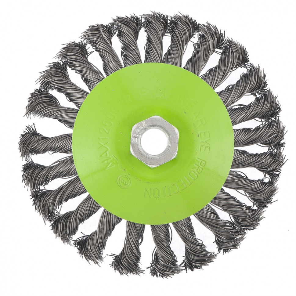 Щетка диаметром 125 мм, с щетиной из крученой проволоки толщиной 0,5 мм, устанавливается на УШМ при помощи гайки М14.