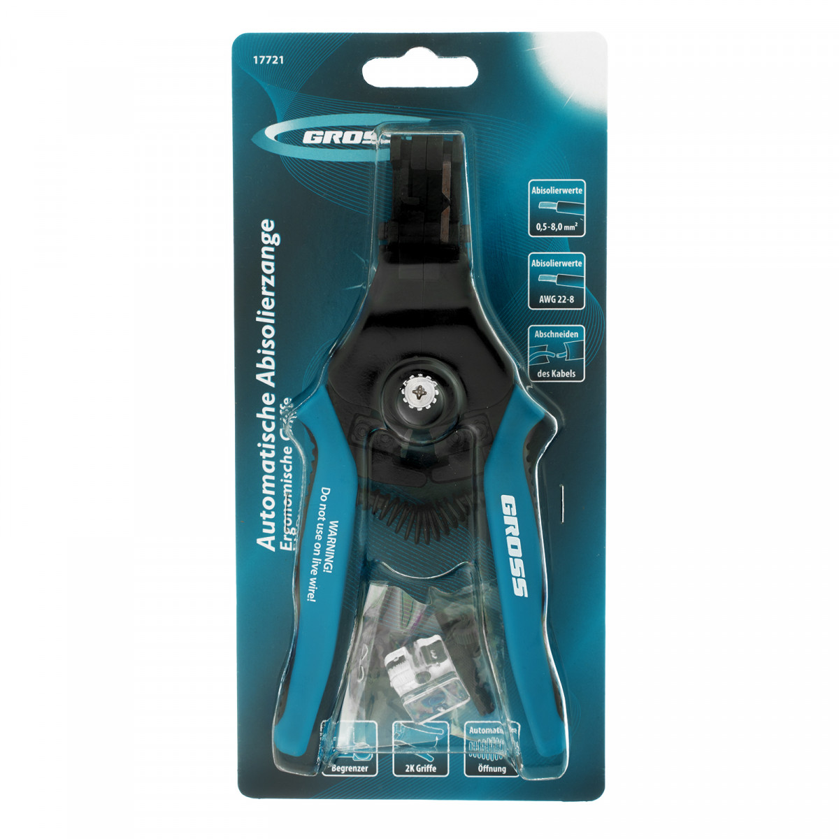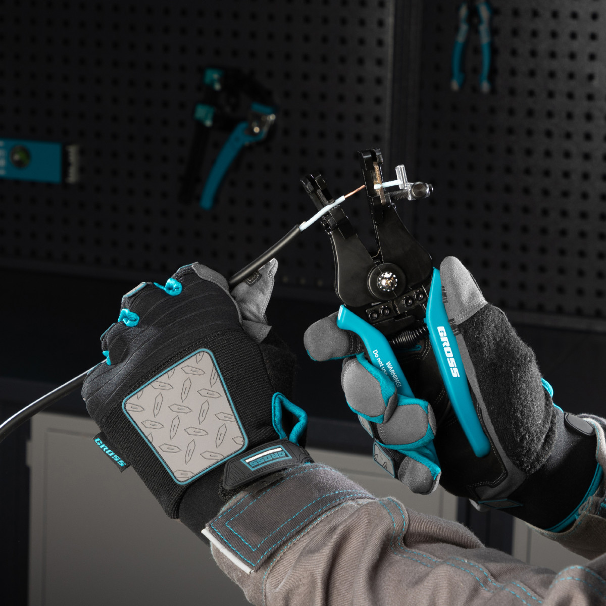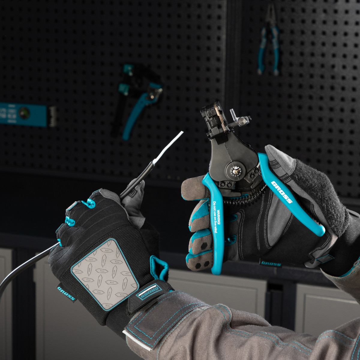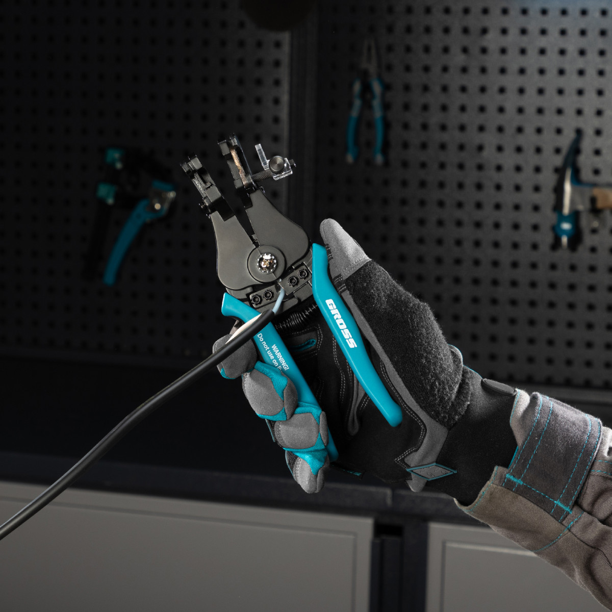 Щипцы для зачистки электропроводов Gross 17721 с лезвием SK5 пригодятся для бытового и профессионального применения при выполнении электромонтажных работ с проводами сечением 0,5, 1,0, 1,5, 2,5, 4,0, 8,0 мм2 (8-22 AWG). С их помощью можно обрезать и зачистить медные и алюминиевые провода, обжать изолированные и неизолированные клеммы. Многофункциональные клещи позволяют регулировать длину снимаемой изоляции и силу зачистки для работы с проводами разных размеров.