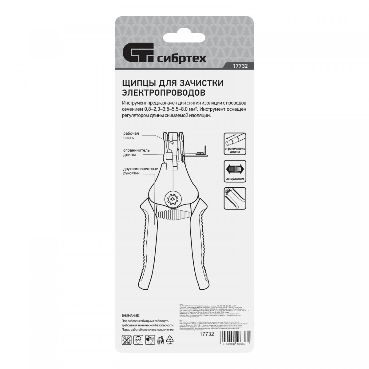 Щипцы Сибртех 17732 рассчитаны на зачистку и снятие изоляции с электропроводов сечением 0,8, 2,0, 3,5, 5,5, 8,0 мм2. Инструмент станет незаменимым помощником в квартире, гараже, на даче, производстве, строительной площадке во время выполнения электромонтажных работ.