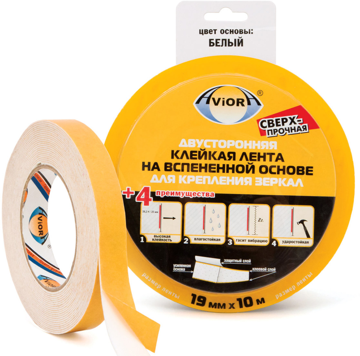 Скотч двухсторонний AVIORA на вспененной основе 19мм*10м для крепления зеркал, белый