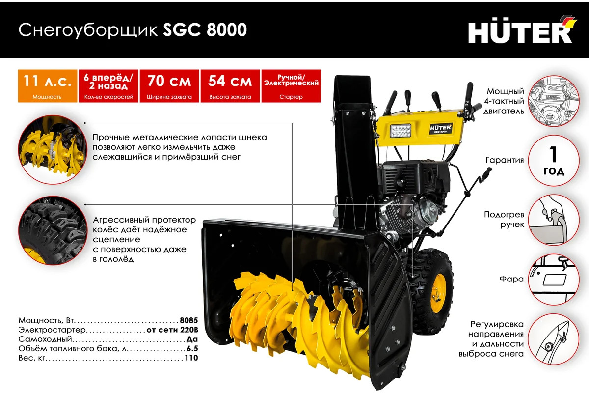 Снегоуборщик Huter SGC 8000 70/7/18 - агрегат, предназначенный для уборки больших объемов снега на любой площади.