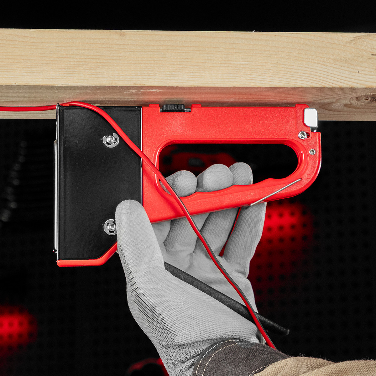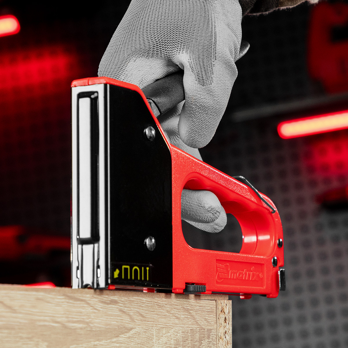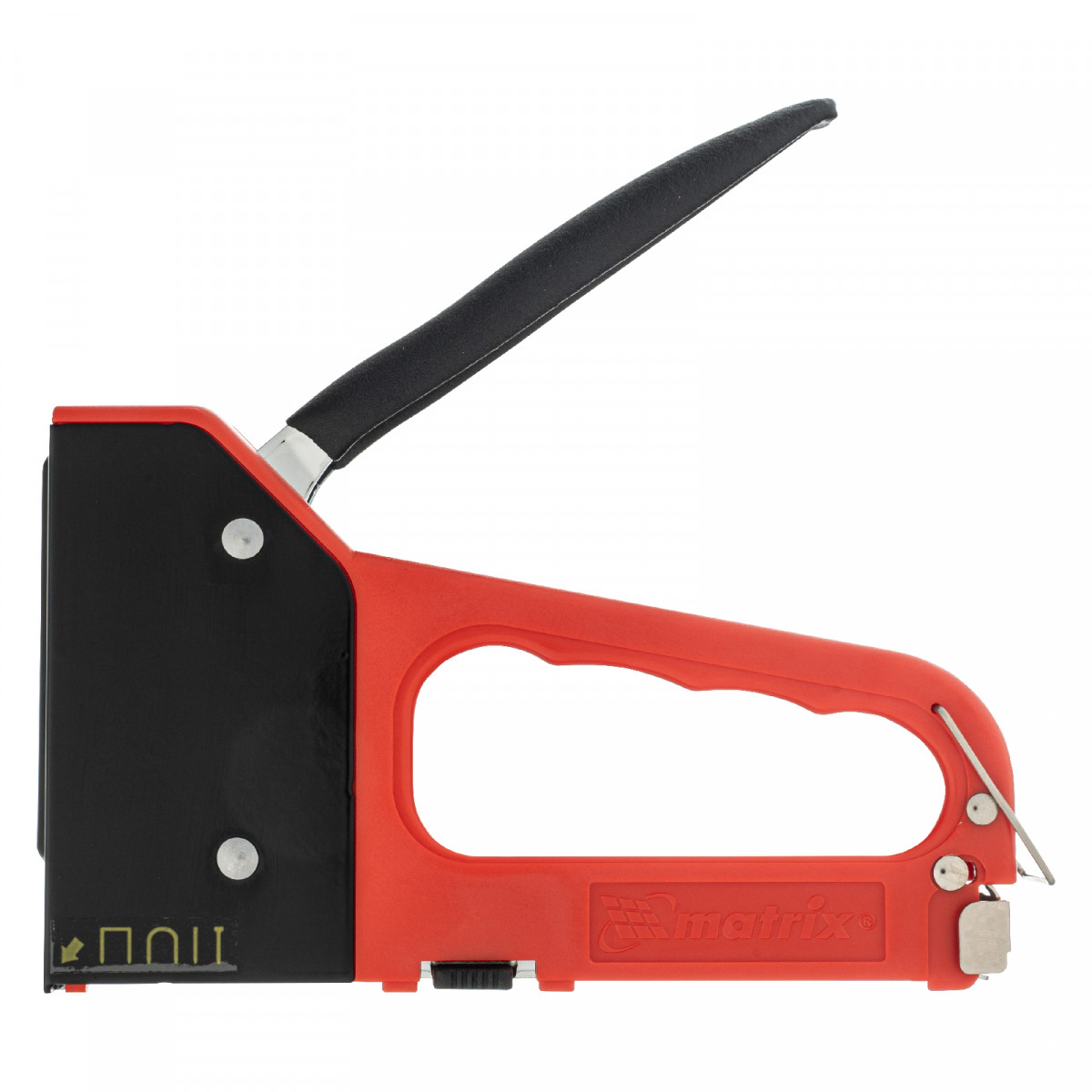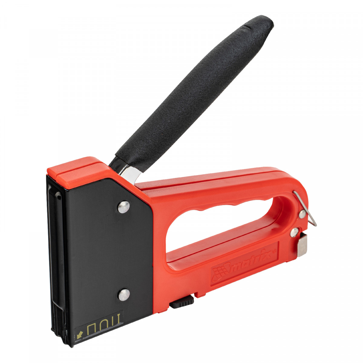 • Безопасное хранение и транспортировка — металлическая скоба фиксирует рукоятку, предотвращая случайное срабатывание степлера.
