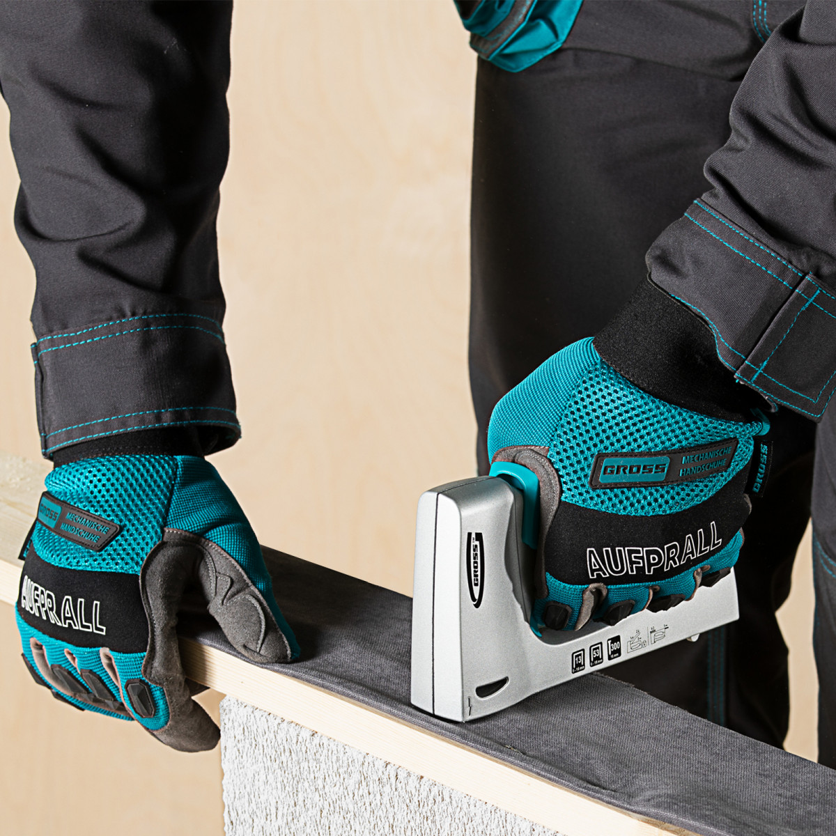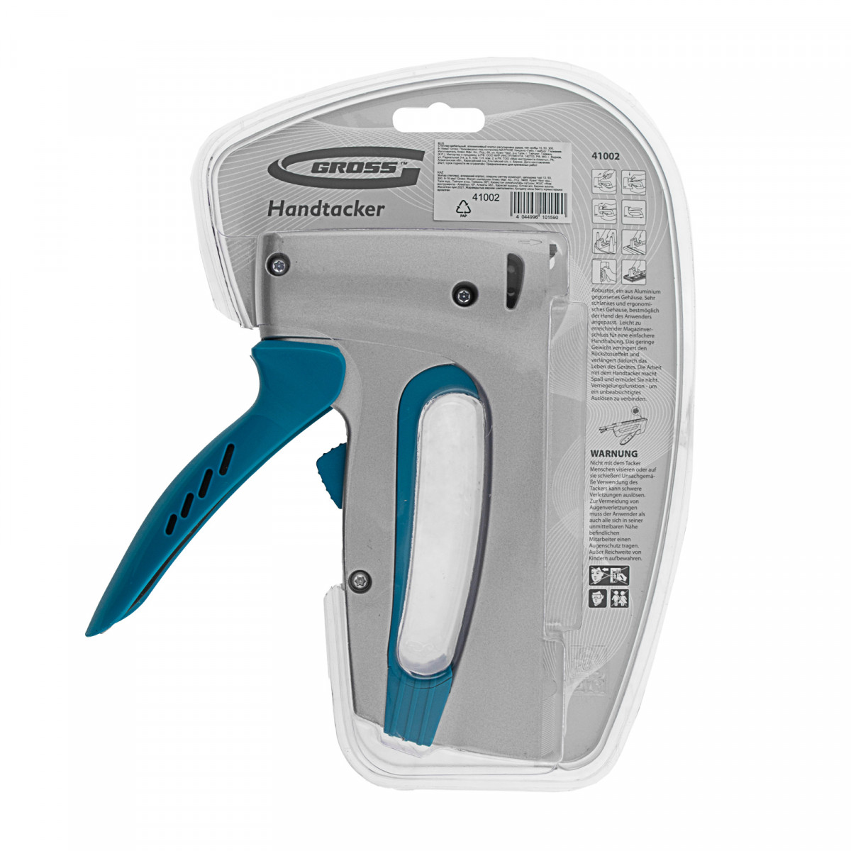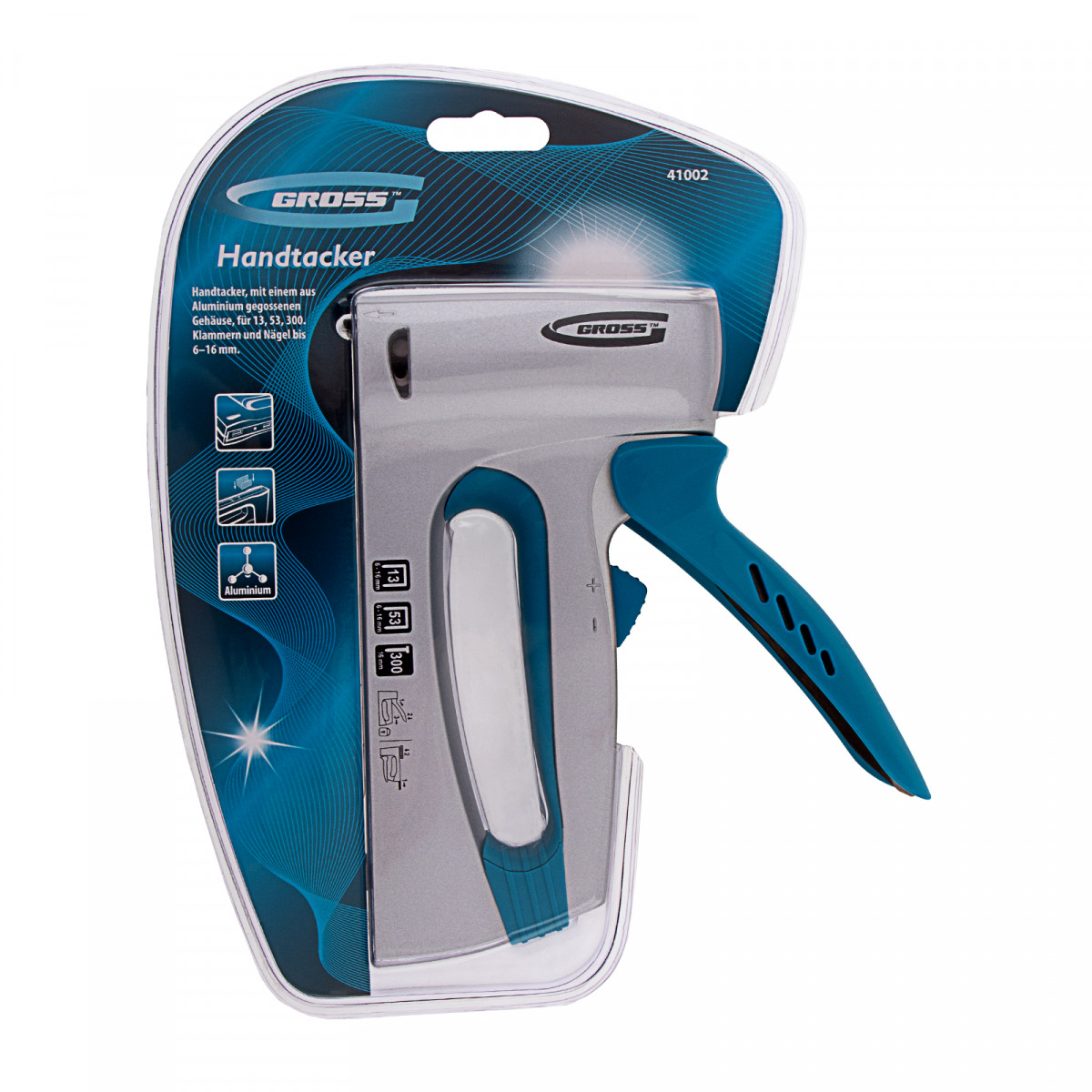Мебельный степлер Gross 41002 в алюминиевом корпусе, с функцией регулировки силы удара, совместим со скобами типа 13 и 53 размером 6-16 мм и гвоздями типа 300 размером 16 мм. Инструмент используют для фиксации на деревянном основании оргалита, фанеры, ДВП, ДСП, пленки, утеплителя и других листовых материалов. Инструмент будет полезен при сборке и обшивке мебели, укладке ковровых покрытий и изоляционных материалов, выполнении багетных работ. Подходит для профессионального применения.