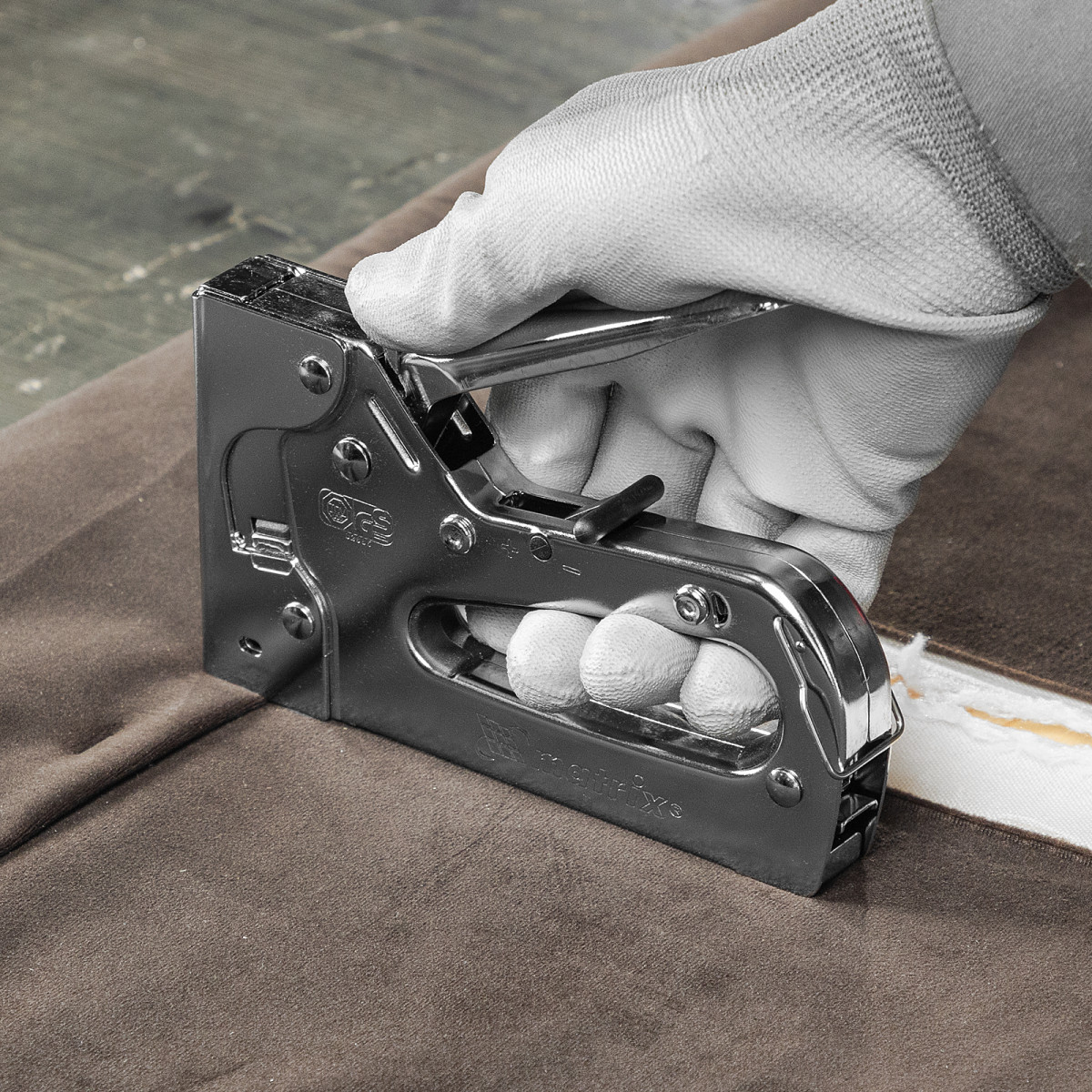 - Безопасное хранение и транспортировка — скоба-фиксатор удерживает рукоятку в нерабочем положении, исключая случайное срабатывание степлера.
