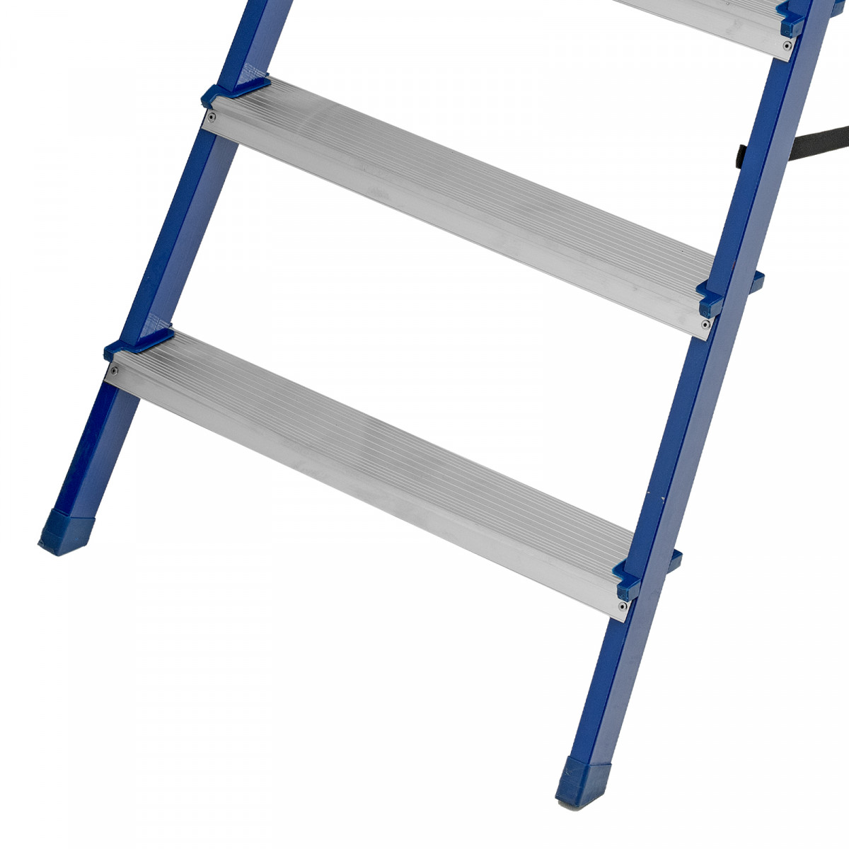 - Надежность — рама изготовлена из профилированной стали, стальная верхняя площадка с зацепами прочно фиксирует стремянку в рабочем положении, страховочные ленты придают дополнительную прочность конструкции.