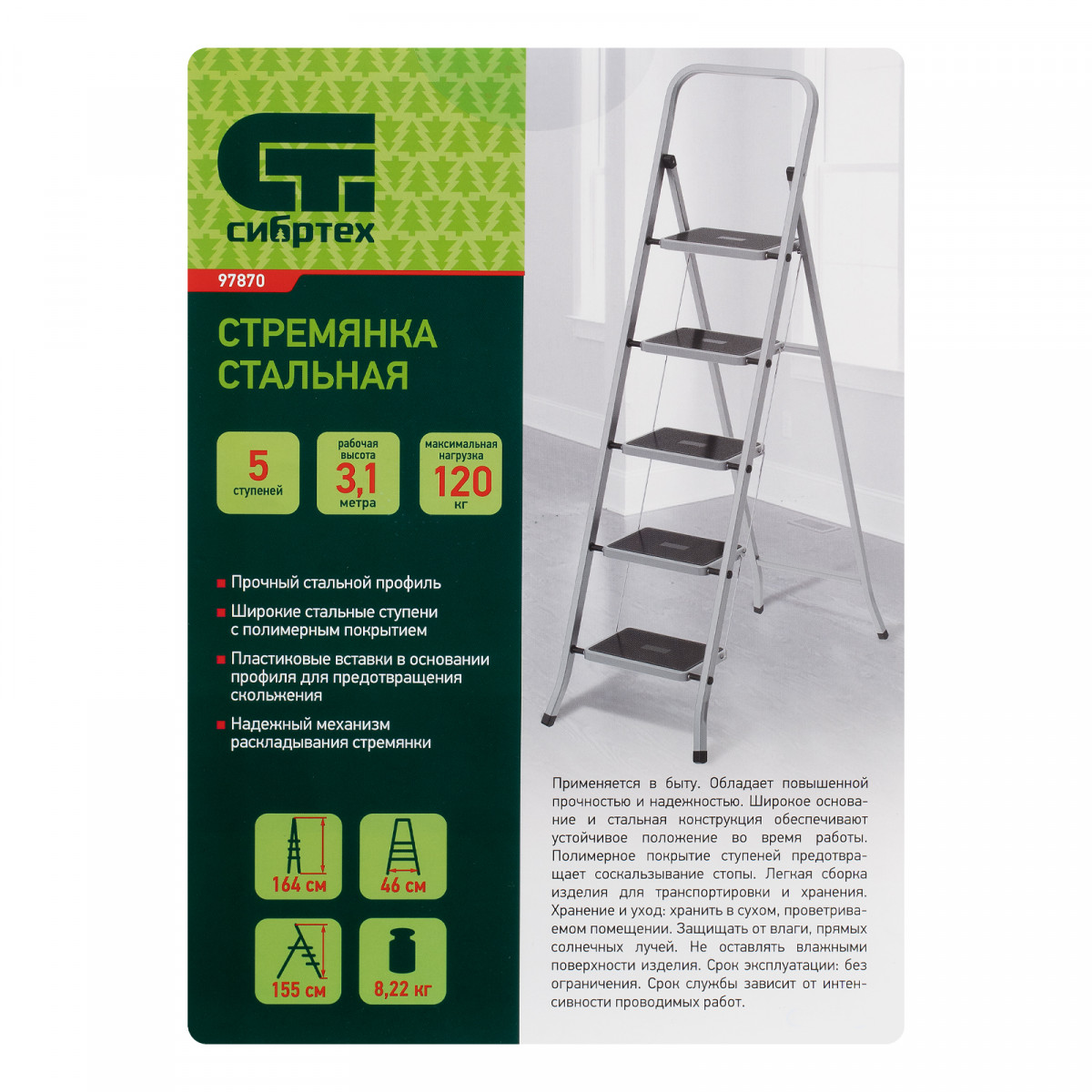 • Удобное хранение — благодаря планке, соединяющей ступени, и шарнирному механизму складывания стремянка в сложенном состоянии очень компактна, ее размеры составляют 1640 х 460 х 65 мм.