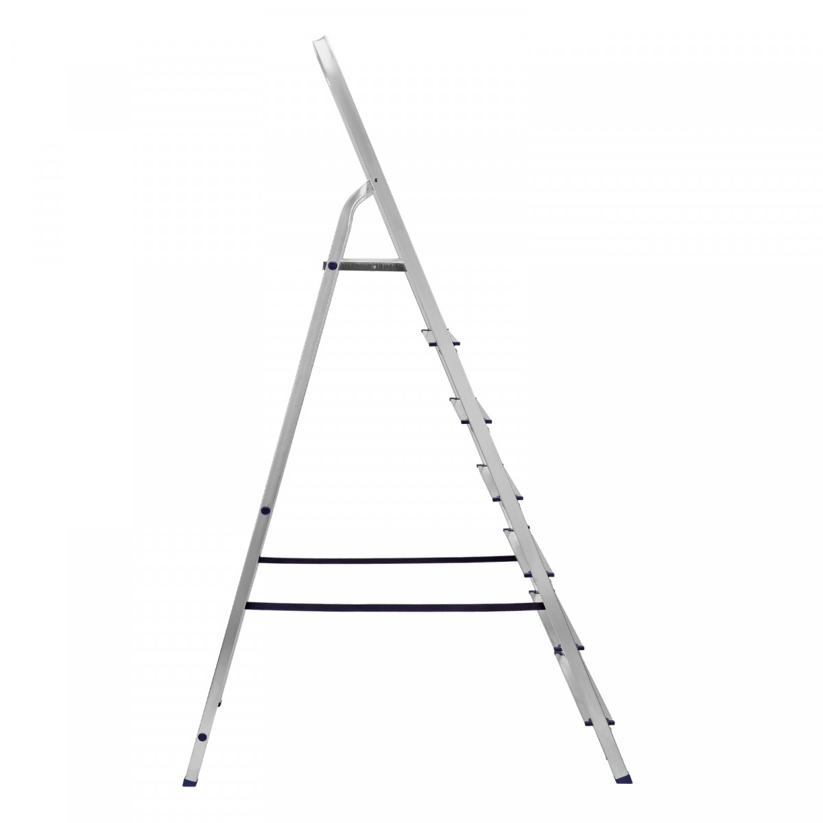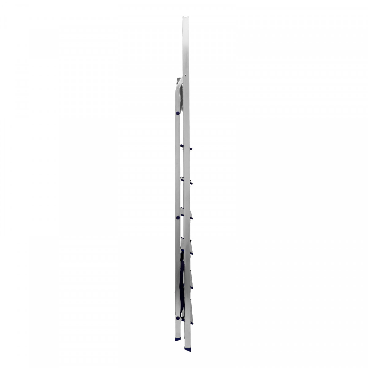 - Надежность — рама из прямоугольного алюминиевого профиля выдерживает нагрузку до 150 кг, широкие ступени закреплены заклепками, страховочные стяжки повышают прочность конструкции.