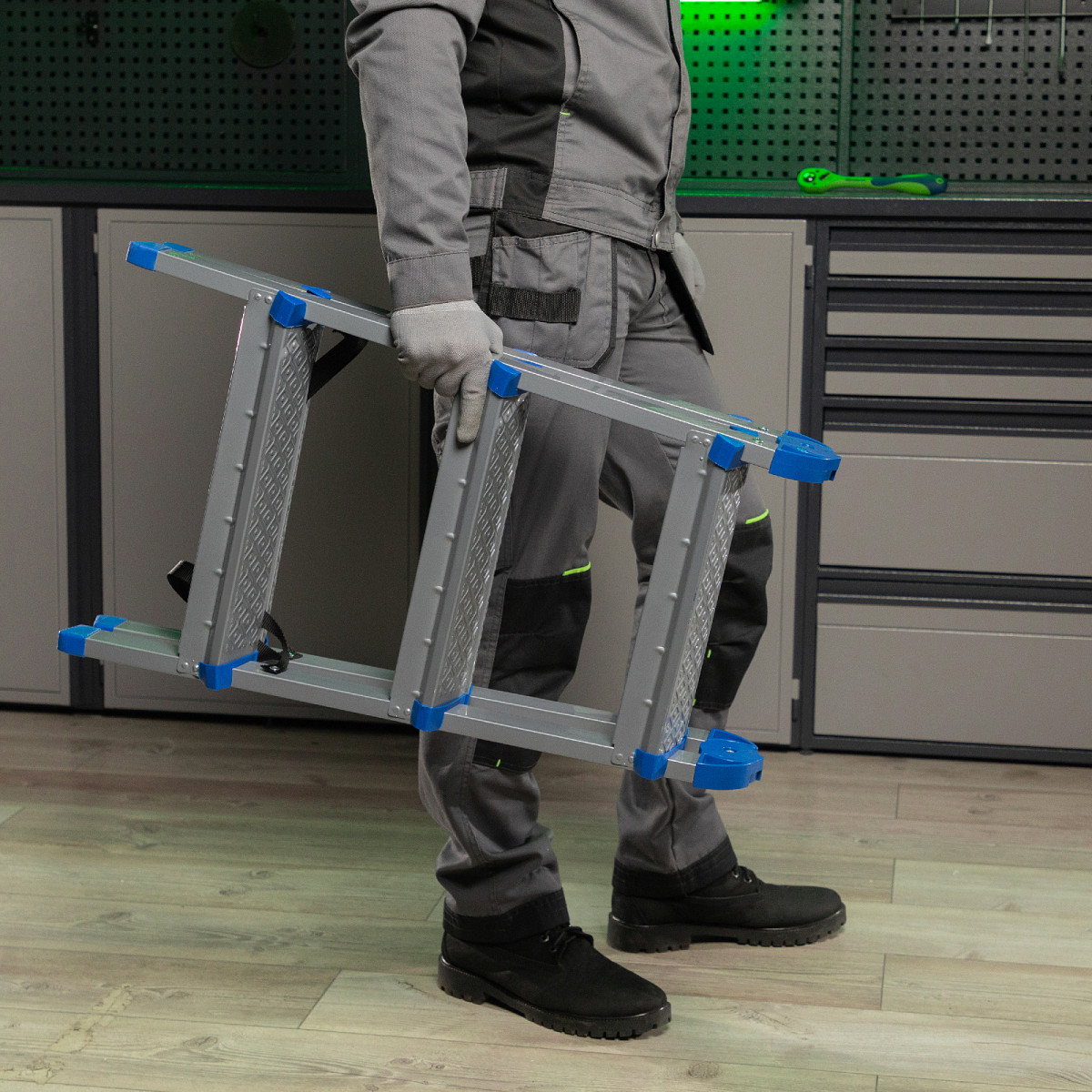 • Удобная транспортировка — стремянка весом 4 кг легко складывается, ее размеры в сложенном состоянии 735 х 435 х 160 мм.