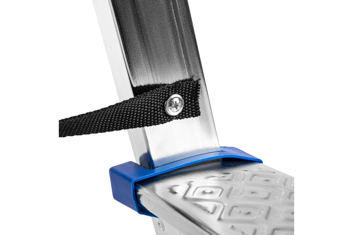 • Надежность — стремянка из стального профиля с широкими ступенями выдерживает вес до 120 кг, страховочные ленты из полиэстера повышают устойчивость