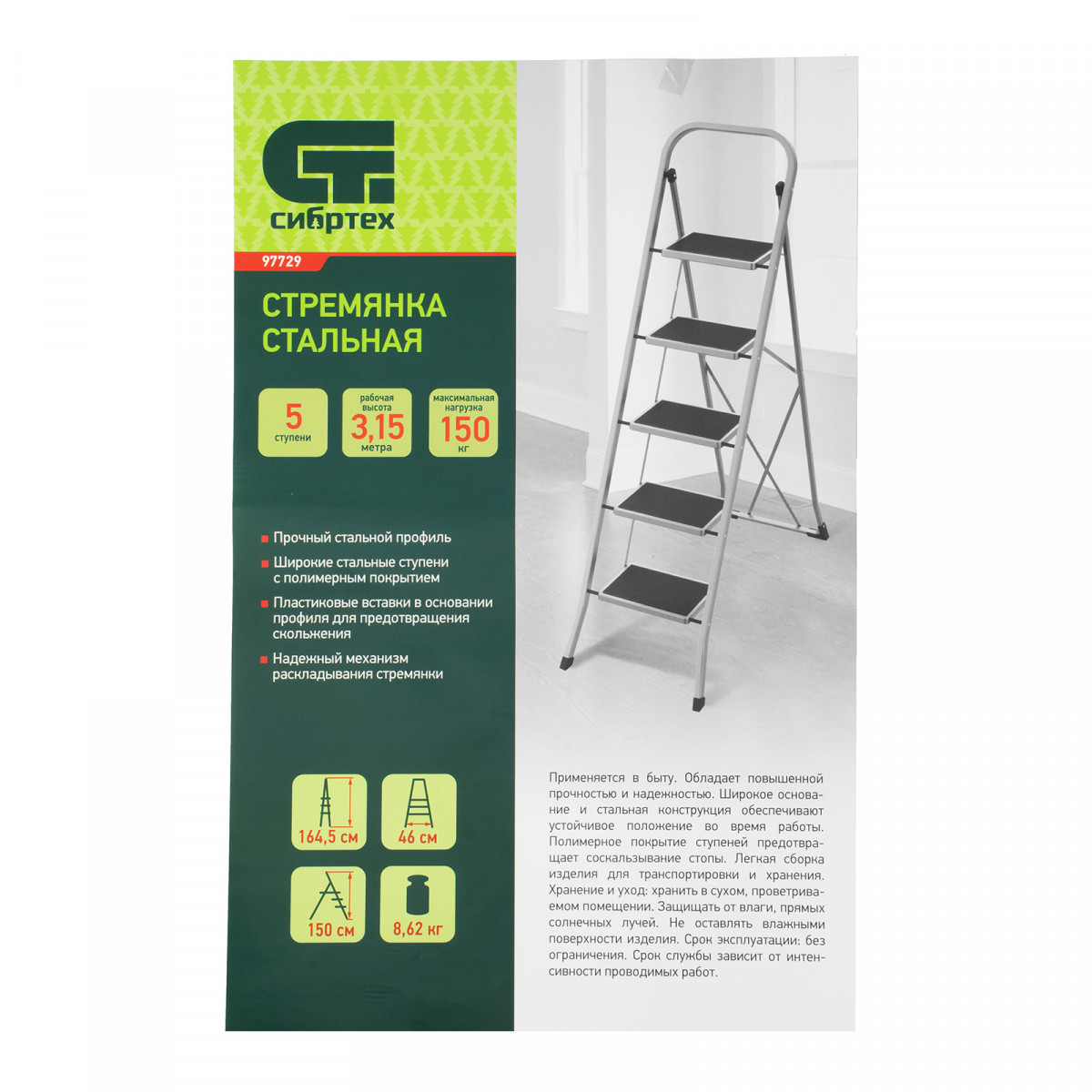 Стальная стремянка Сибртех 97729 с 5 широкими ступенями размером 20 x 30 см, с полимерным покрытием, позволяет выполнять различные работы на высоте, превышающей человеческий рост. С ее помощью можно достать нужный предмет с полки, покрасить стену, поменять лампочку, вытереть пыль на шкафу и т.д. Верхняя ступень находится на высоте 115,5 см от опорной поверхности, рабочая высота составляет 315,5 см (при среднем росте пользователя 170 см). Дуга безопасности и широкие ступени с нескользящим покрытием обеспечивают устойчивое положение пользователя. Стремянку следует размещать на ровной поверхности и использовать для работы только с ручным инструментом.