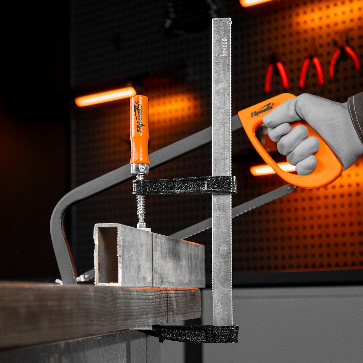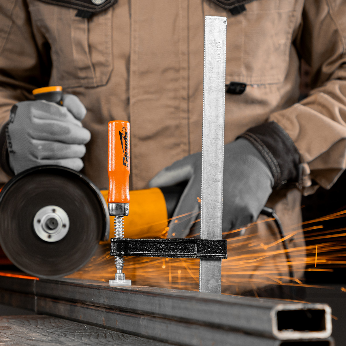 F-образная струбцина Sparta 204385 длиной 365 мм и величиной зажима 300 х 120 мм позволяет фиксировать заготовки из металла, древесины и других материалов для их соединения или обработки. Используется в столярном и слесарном деле. Деталь помещают между губками, одна из которых подвижна и служит для регулировки величины захвата. Винтовой зажим позволяет фиксировать заготовку со значительным усилием. Элементы конструкции выдерживают высокую температуру, поэтому струбцина подходит для проведения сварочных работ, при этом пластиковые накладки необходимо снять.