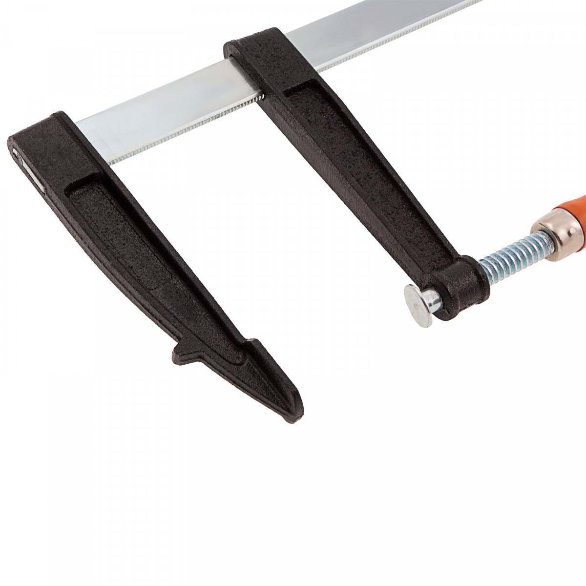F-образная струбцина Sparta 204425, 600 х 120 х 670мм, используется в столярном и слесарном деле и позволяет фиксировать заготовки из металла, древесины и других материалов для их соединения или обработки. Деталь помещают между губками, одна из которых подвижна и служит для регулировки величины захвата. Винтовой зажим позволяет прикладывать значительное усилие для надежной фиксации. Защитные накладки предотвращают повреждение детали. Элементы конструкции выдерживают высокую температуру, поэтому струбцина подходит для проведения сварочных работ, при этом пластиковые накладки необходимо снять.