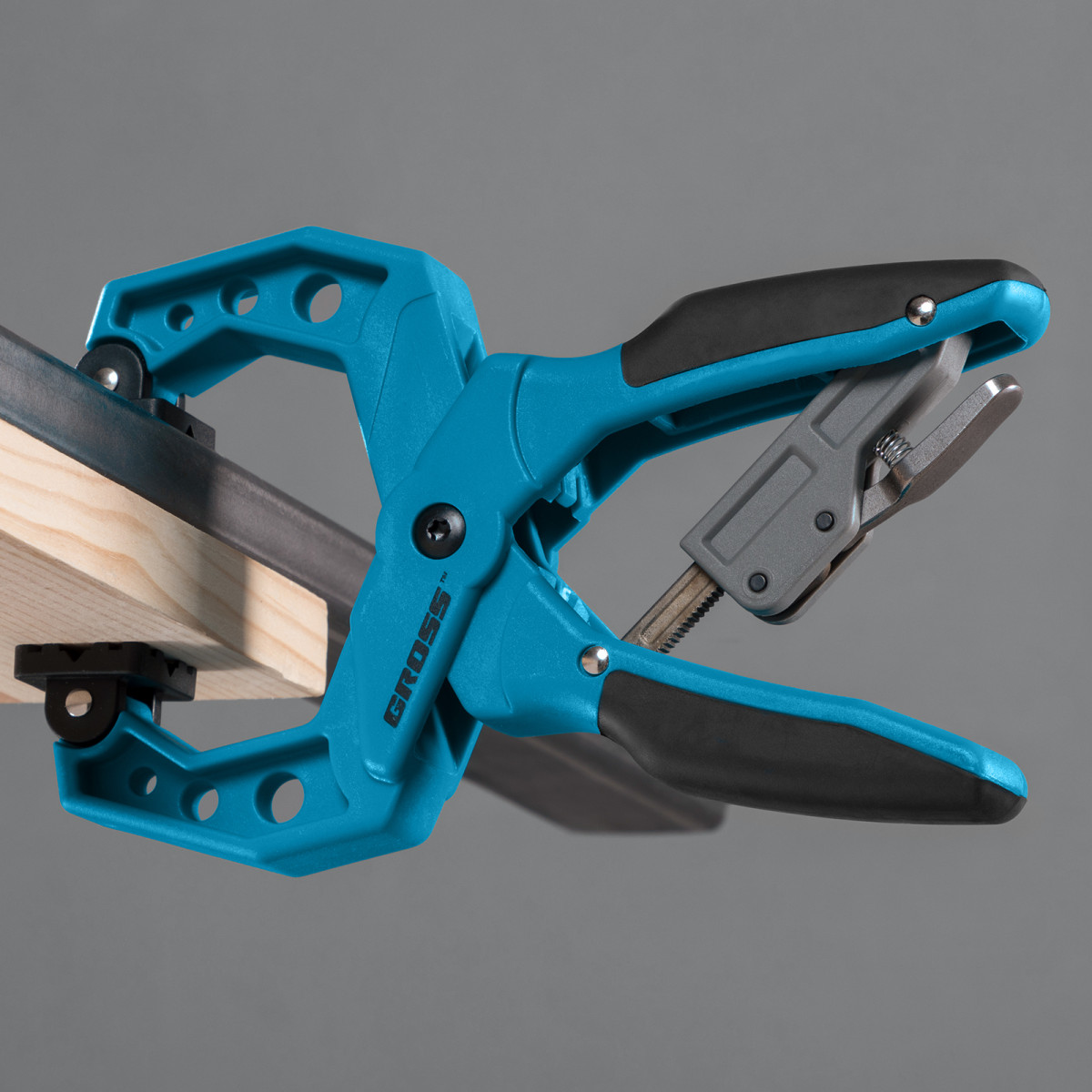 • Курковый фиксатор обеспечивает моментальное раскрытие струбцины, что облегчает работу с ней.