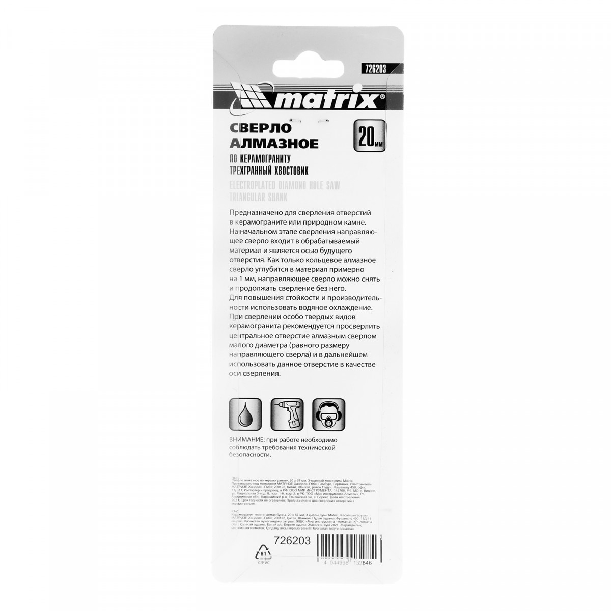 Универсальное алмазное сверло по керамограниту Matrix 726203 размером 20 х 67 мм, с 3-гранным хвостовиком, применяется для получения отверстий в стекле, плитке, кафеле. За счет высокой концентрации алмазов в режущем слое оно легко справляется со сверлением керамогранита. Сверло рассчитано на профессиональное использование с дрелями и шуруповертами. Водяное охлаждение в процессе работы значительно повышает срок службы оснастки.