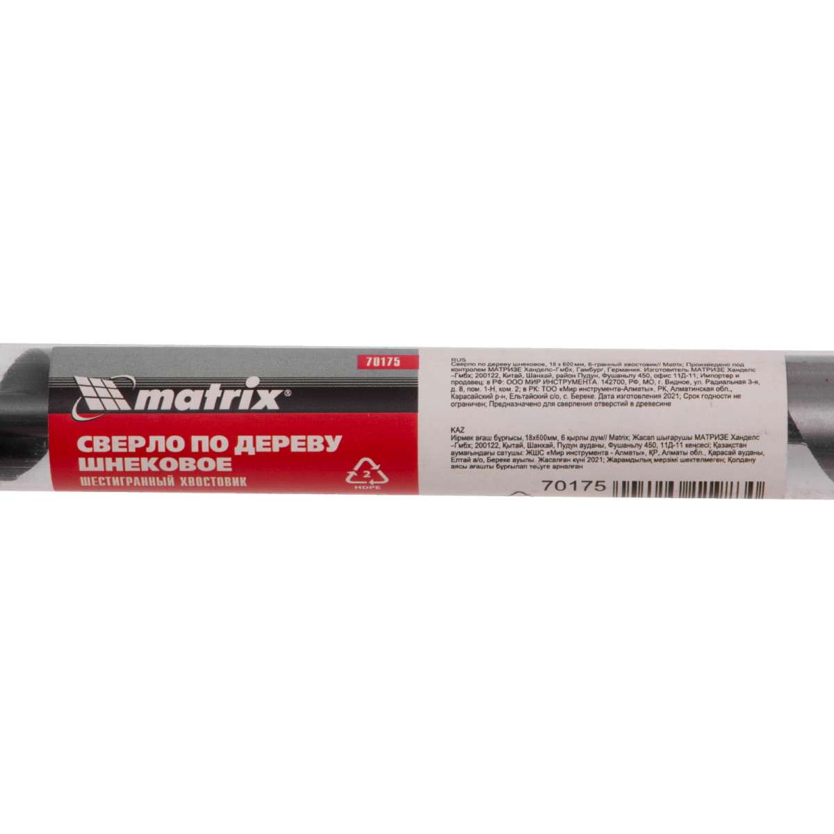 Сверло по дереву шнековое, 18 х 600 мм, шестигранный хвостовик Matrix