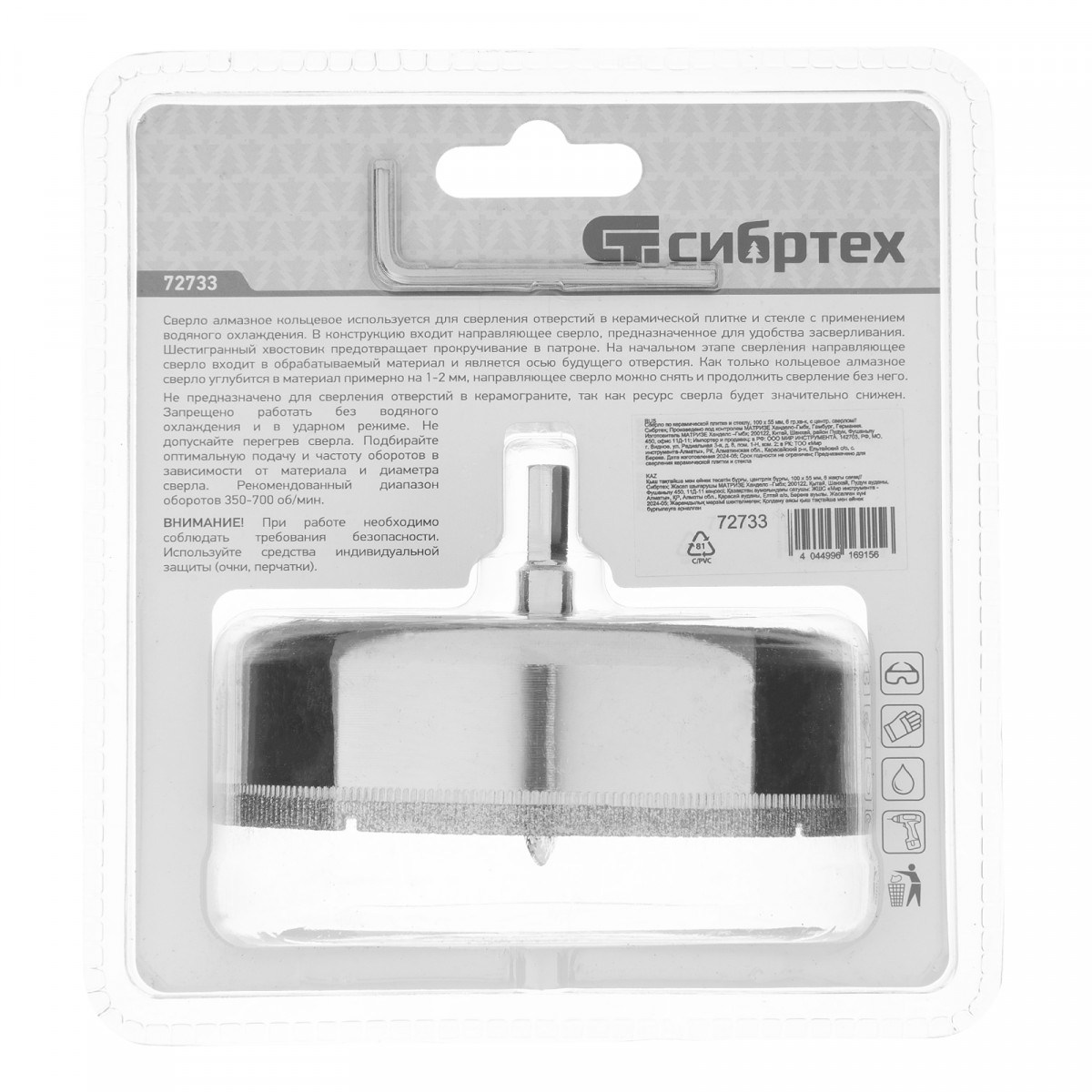 Сверло Сибртех 72733 размером 100 х 55 м, с шестигранным хвостовиком и центрирующим сверлом, позволяет получать отверстия в керамической плитке и стекле. Его устанавливают на дрель или шуруповерт, рекомендуемый диапазон рабочих оборотов 350-700 об/мин. Оснастка используется при выполнении бытовых ремонтных и отделочных работ.
