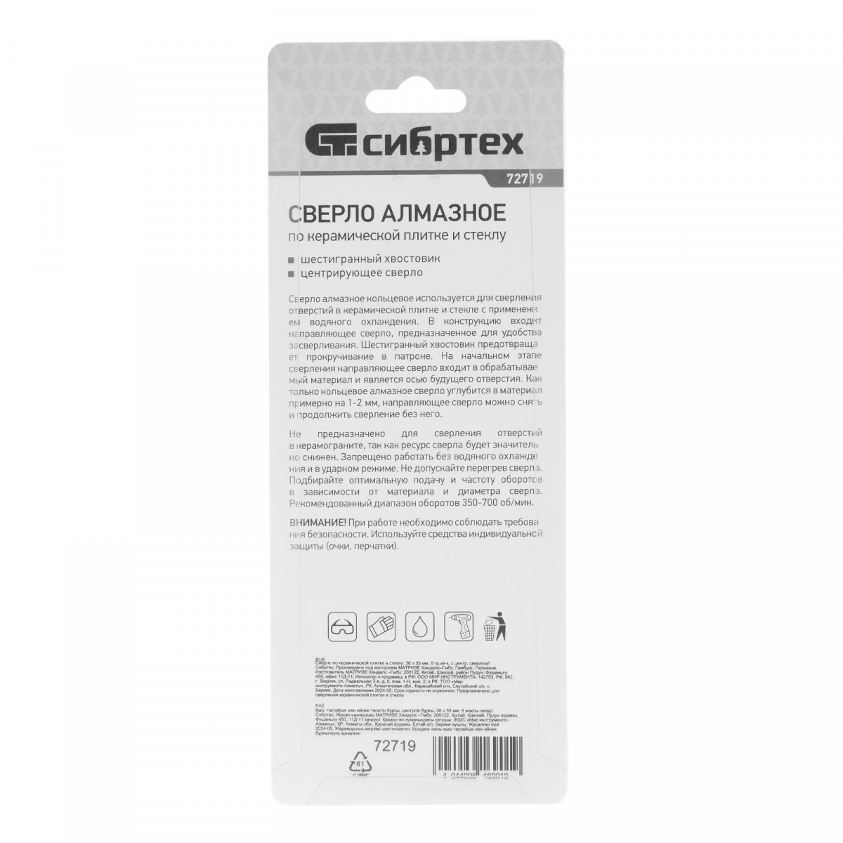 Сверло Сибртех 72719 размером 38 х 55 м, с шестигранным хвостовиком и центрирующим сверлом, позволяет получать отверстия в керамической плитке и стекле. Его устанавливают на дрель или шуруповерт, рекомендуемый диапазон рабочих оборотов 350-700 об/мин. Оснастка используется при выполнении бытовых ремонтных и отделочных работ.