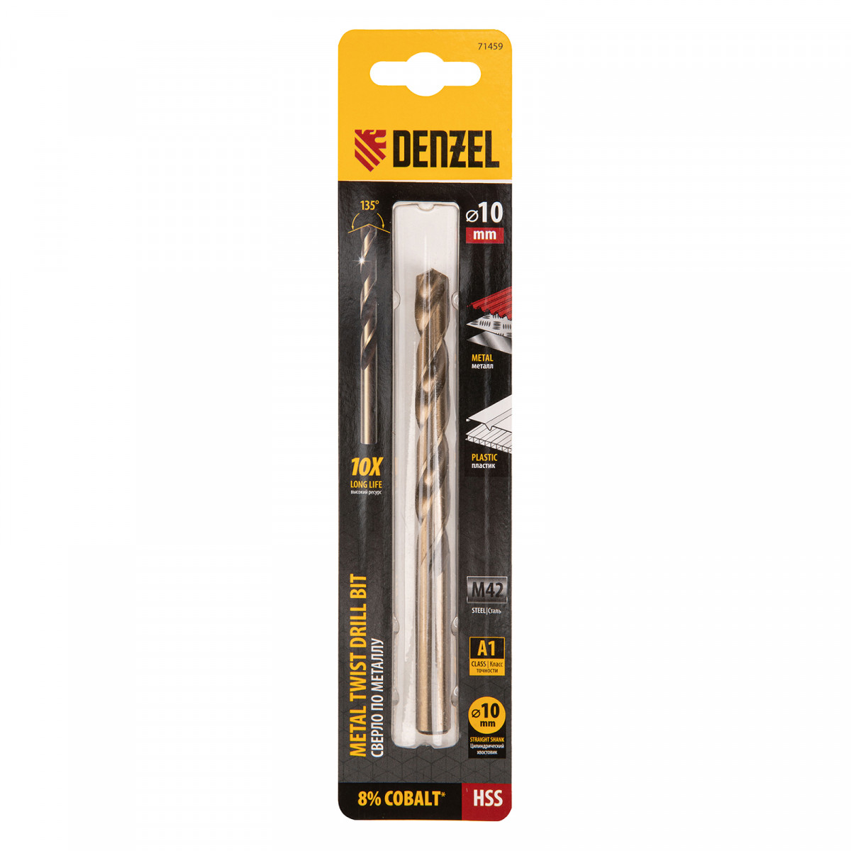 Кобальтовое сверло по металлу Denzel 71459 диаметром 10 мм, из стали HSS Co-8%, позволяет получать отверстия высокой точности в нержавеющей стали, цветных металлах, легированных и нелегированных сталях с пределом прочности до 1100 Н/мм2, а также в жестком пластике. Угол заточки 135° обеспечивает повышенную точность и чистоту сверления.