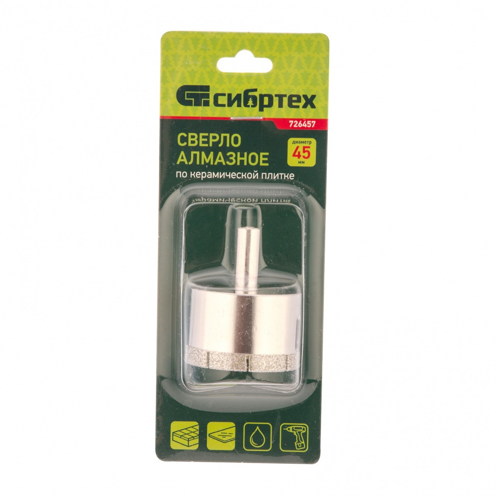Сверло Сибртех 726457 размером 45 х 55 мм, с цилиндрическим хвостовиком, используется для получения ровных отверстий без сколов в стекле и керамической плитке. Устанавливается в патрон дрели или шуруповерта, работающих в диапазоне 350-700 об/мин. Во время работы рекомендуется применять водяное охлаждение — это существенно увеличит ресурс оснастки. Использование кондуктора (арт. 72830) позволяет точно позиционировать сверло и облегчает засверливание. Оснастка подходит для выполнения работ небольшого объема и рекомендована для использования в быту.