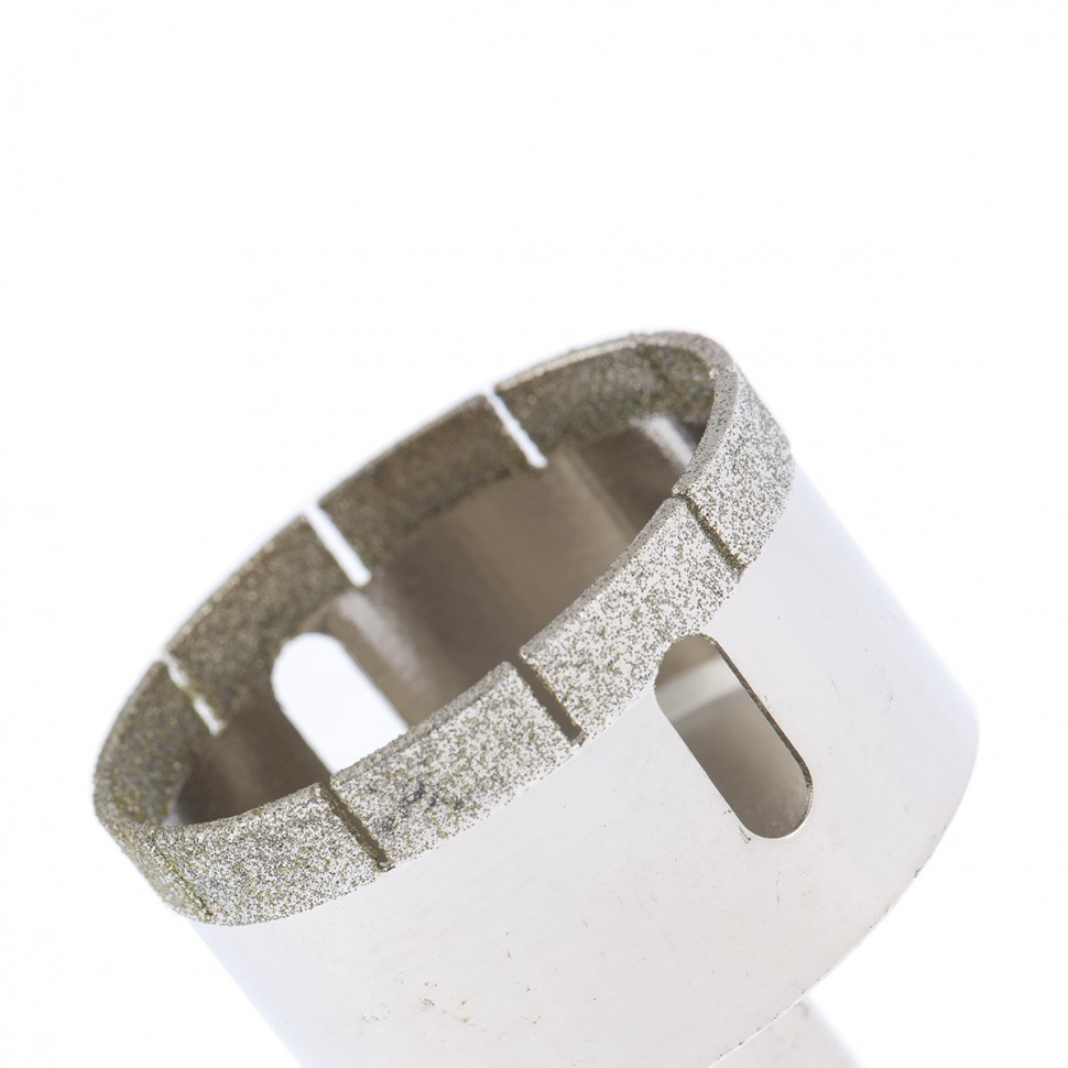 Сверло Сибртех 726507 размером 50 х 55 мм, с цилиндрическим хвостовиком, используется для получения ровных отверстий без сколов в стекле и керамической плитке. Устанавливается в патрон дрели или шуруповерта, работающих в диапазоне 350-700 об/мин. Во время работы рекомендуется применять водяное охлаждение — это существенно увеличит ресурс оснастки. Использование кондуктора (арт. 72830) позволяет точно позиционировать сверло и облегчает засверливание. Оснастка подходит для выполнения работ небольшого объема и рекомендована для использования в быту.