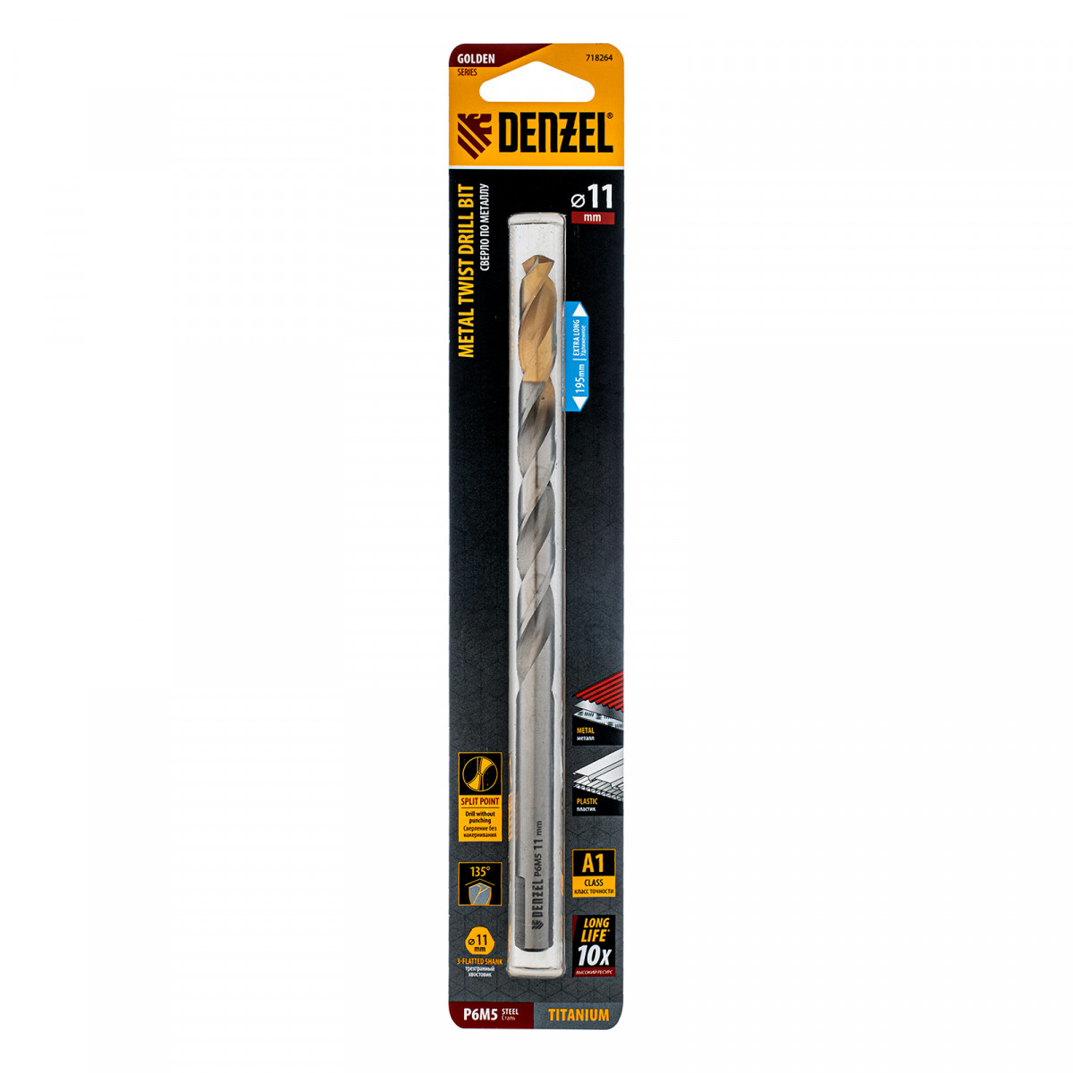 Сверло спиральное по металлу 11 х 195 мм, Р6М5, Golden Tip, удлиненное Denzel